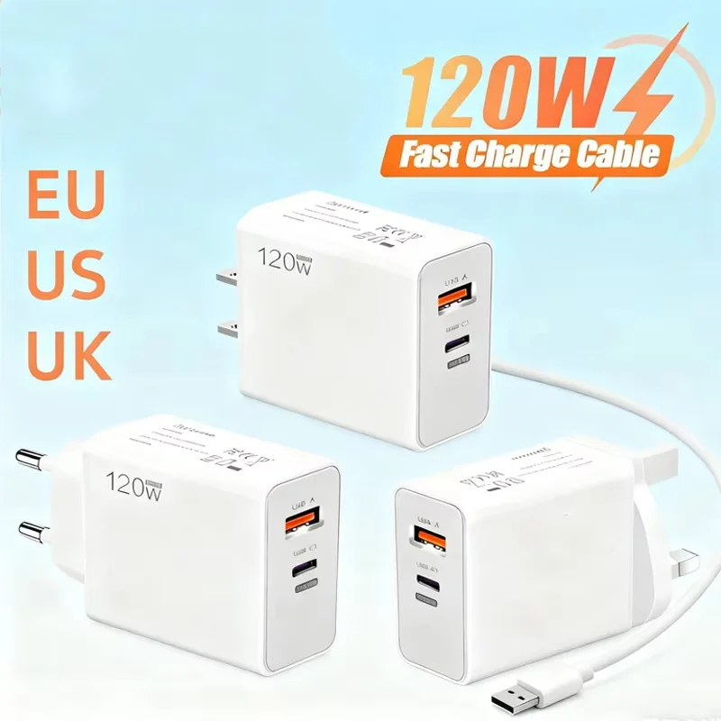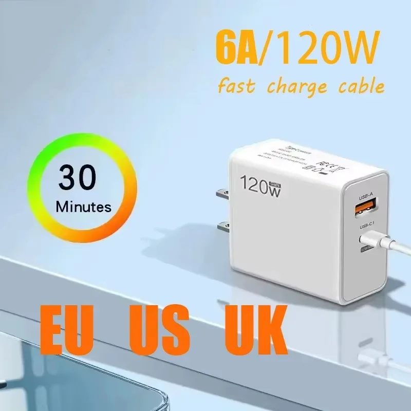 120W Type C USB Phone Charger Fast Charging Data Cable Mobile Phone Power Adapter For Huawei Samsung Wall Charger