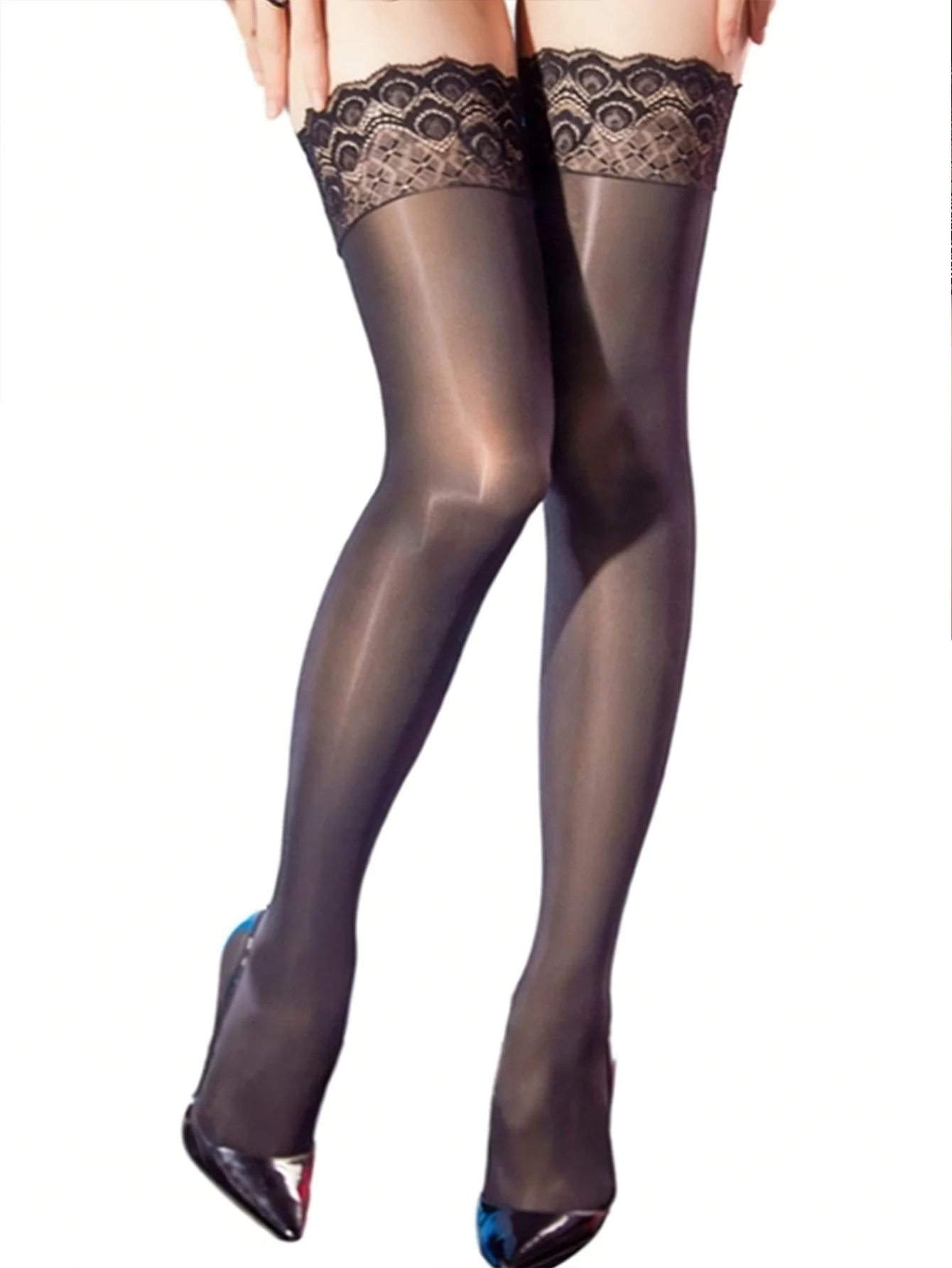 1 Pair Horse Oil Shinny Silk Stockings Silicone Non-Slip Lace Thigh High Socks Summer Ultra Thin Hosiery Lingerie