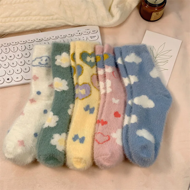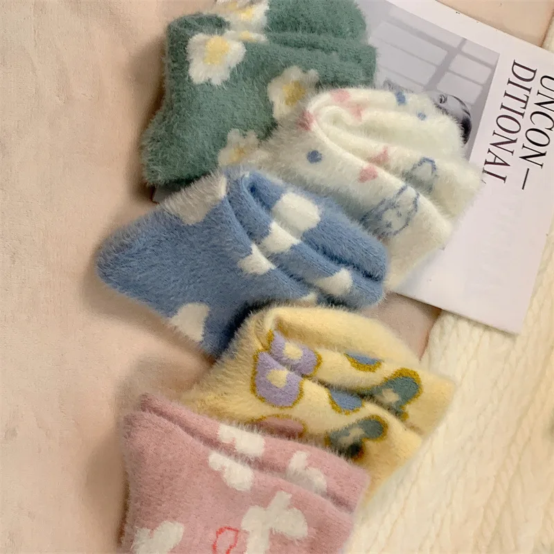 5 Pairs Women's Socks Set Korean Cute Cartoon Plush Kawaii Versatile Thick Warm Comfortable Soft Floor Socks For Girl Wholesale
