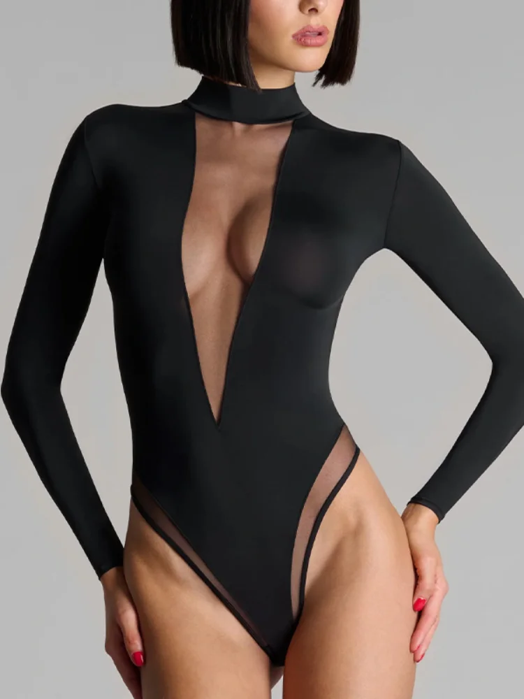 European and American spicy girl lace solid color long sleeved bodysuit spring and autumn women's slim fit tops