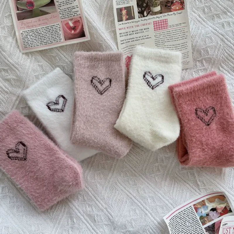 5 Pairs Women's Thickened Mink Socks Pink Heart Embroidery Plush Sleepwear Solid Color Warm Middle Tube Autumn Winter Home Socks