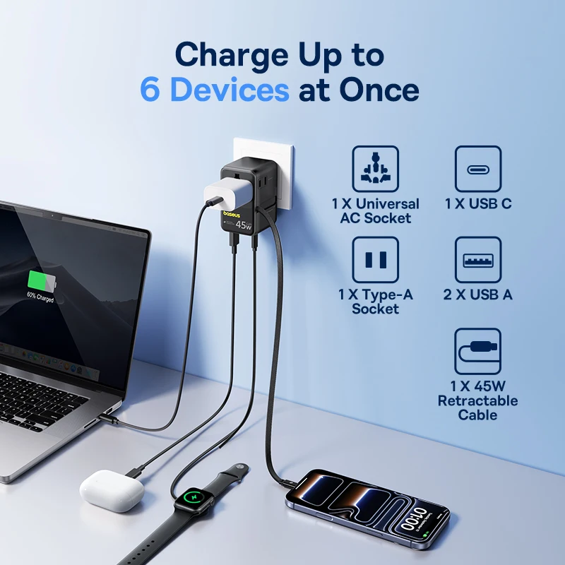 【NEW】Baseus 6-IN-1 GaN Phone Charger Universal Travel Adapter 45W/70W Retractable Cable 2AC Socket EU/UK/US Plug USB Charger