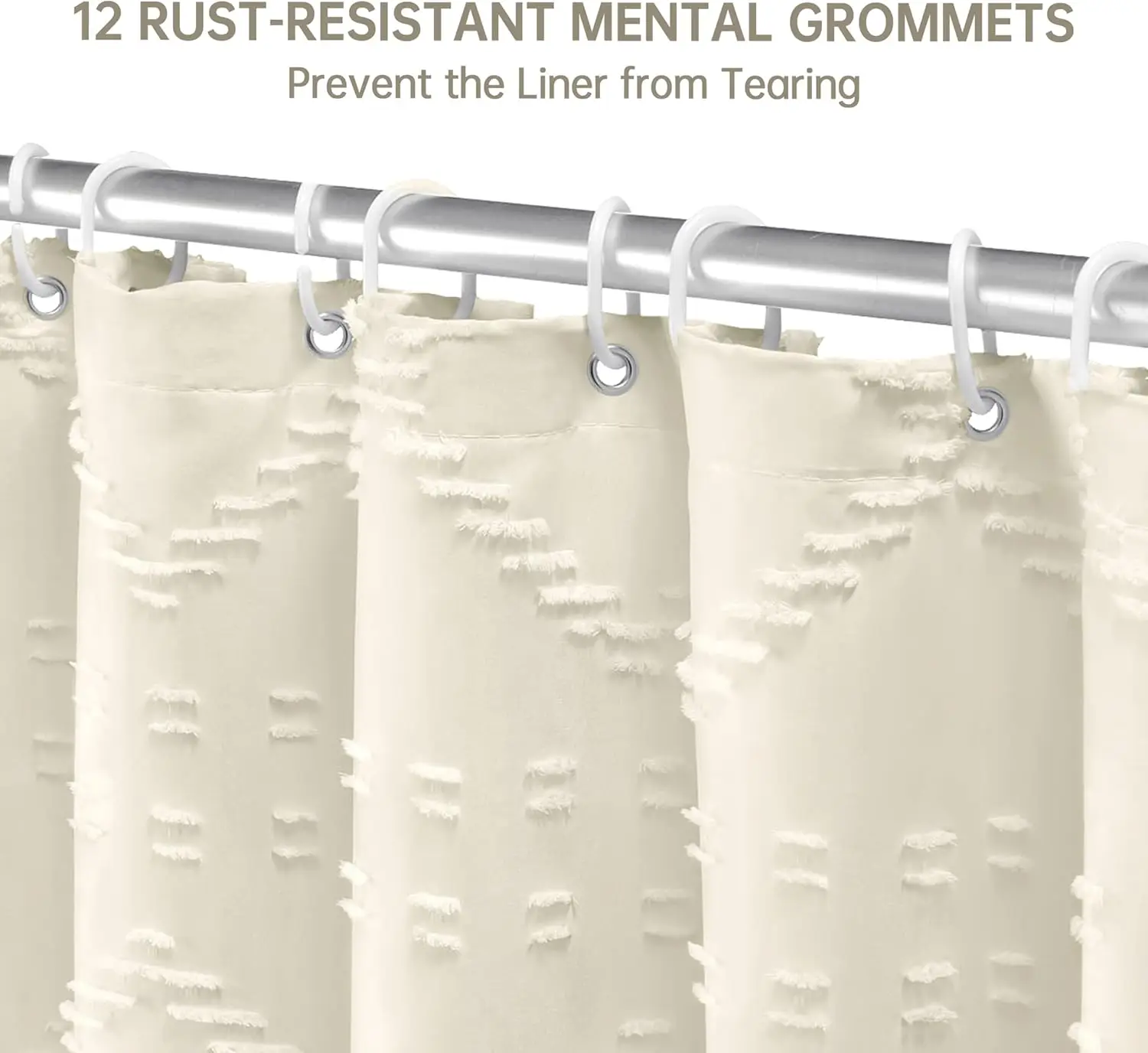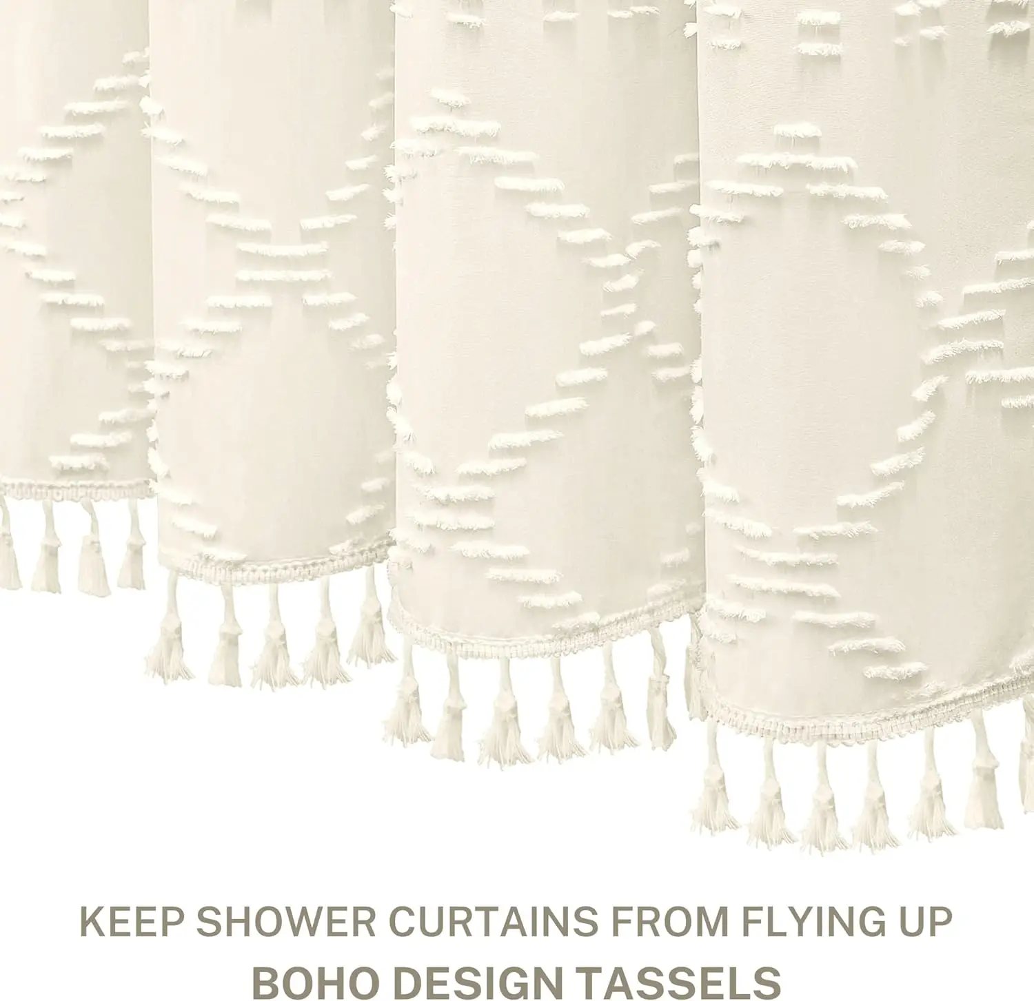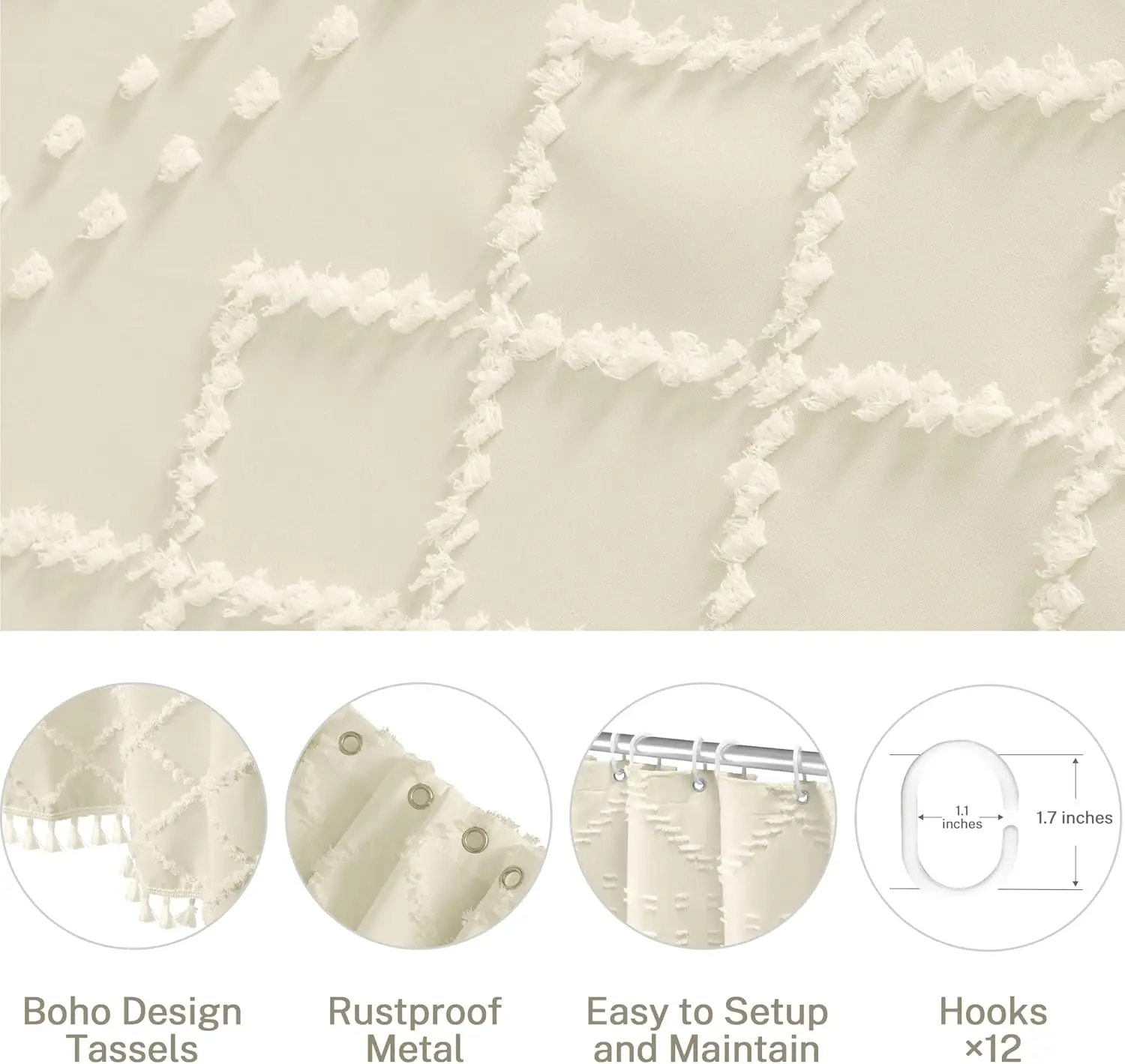 Soft Diamond-Patterned Shower Curtain - Waterproof Fabric with Boho Tassels,12 Plastic Hooks Included for Modern Bathroom