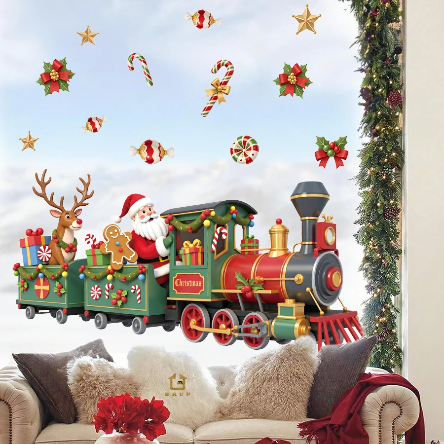 Whimsical Santa Train Christmas Wall Stickers With Candy Holly Removable Self-Adhesive For Kids Room Restaurant Shop Decor