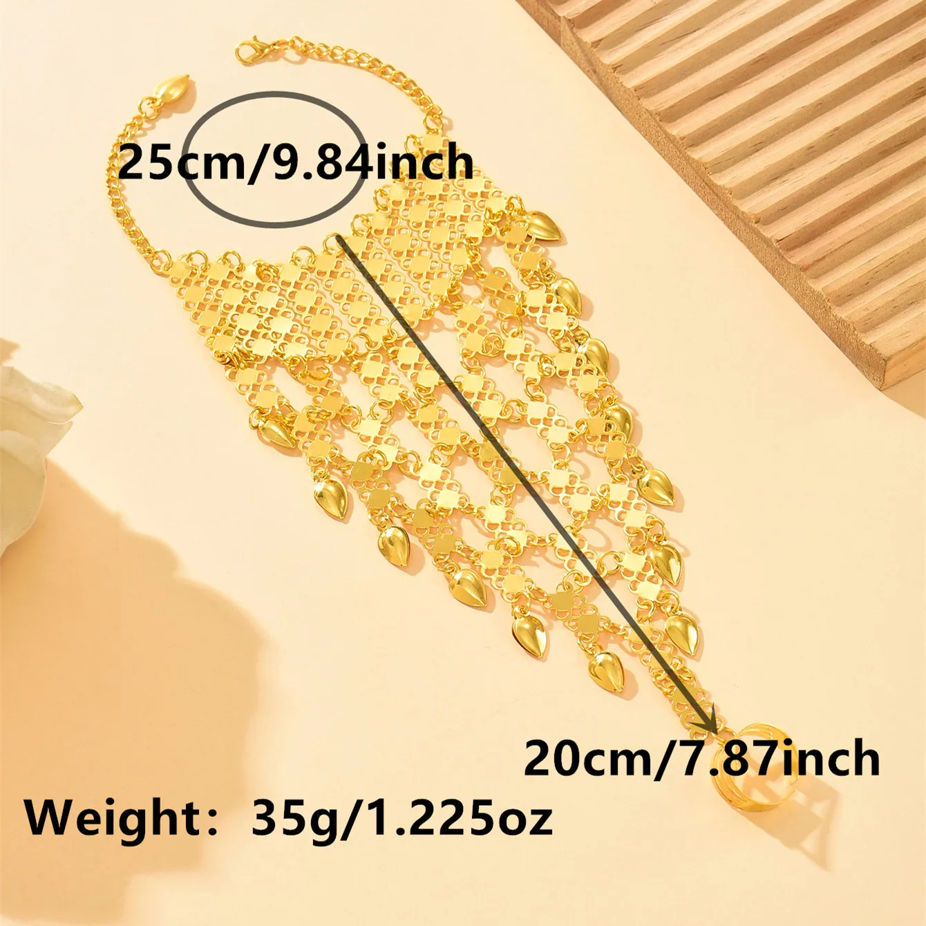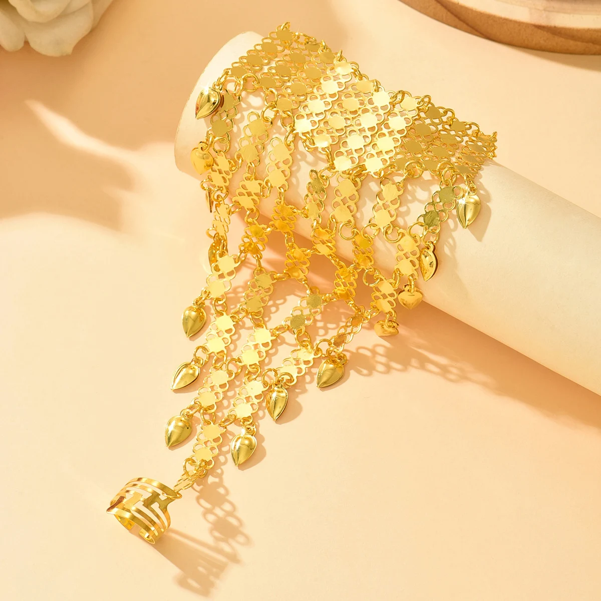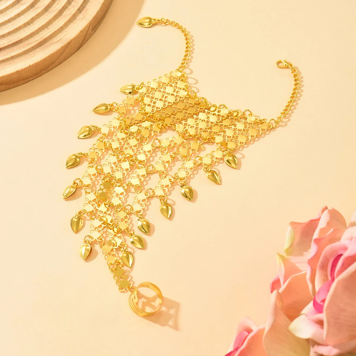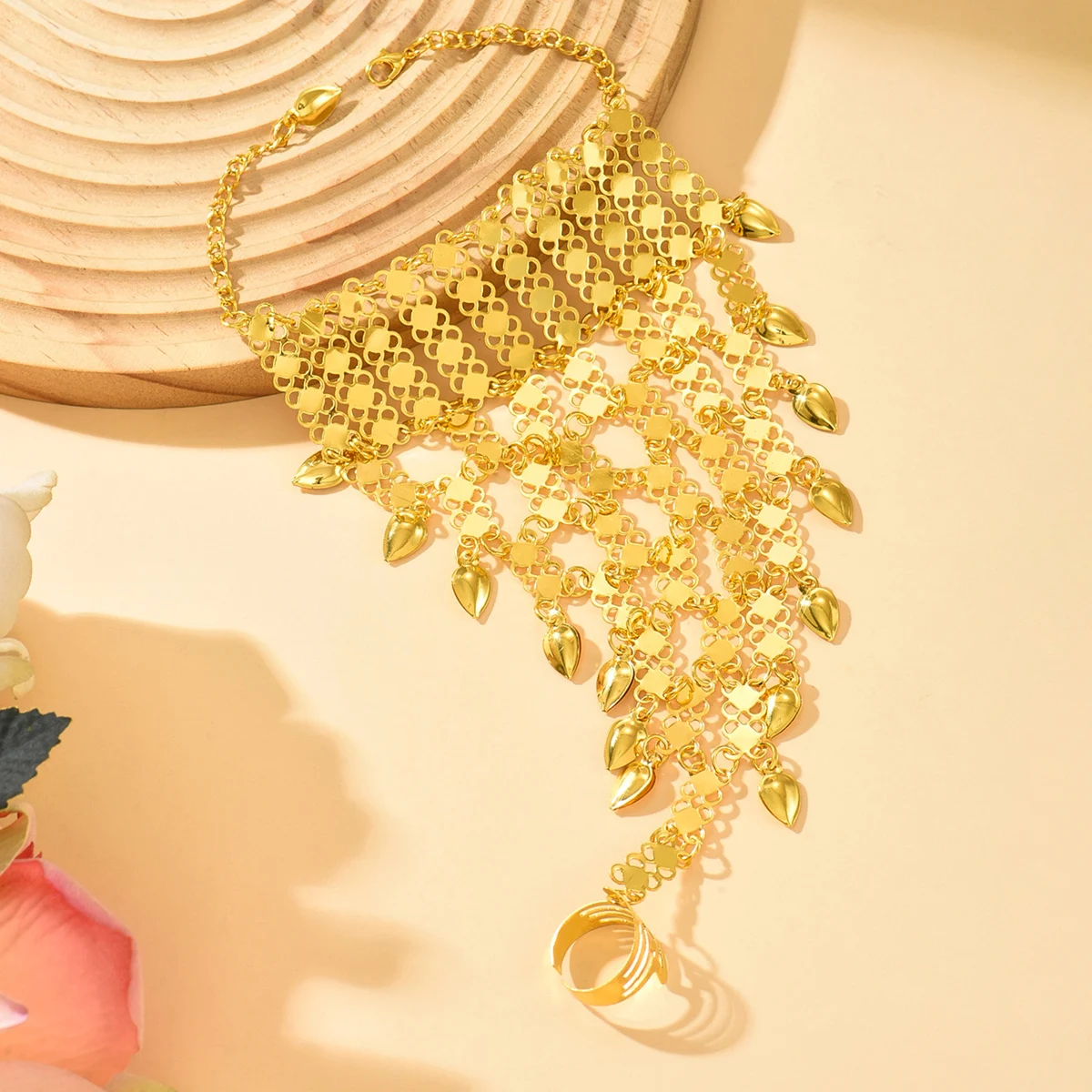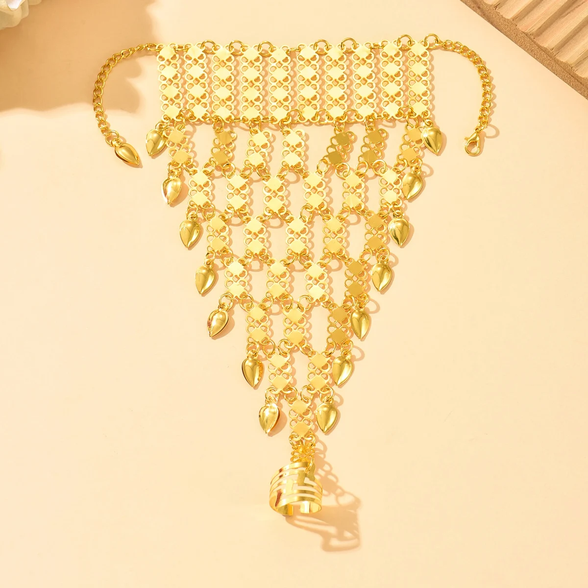 Vintage Ethnic Style Golden Plated Alloy Finger Bracelet With Ring Middle Eastern Exotic Back Chain Accessory For Dancer