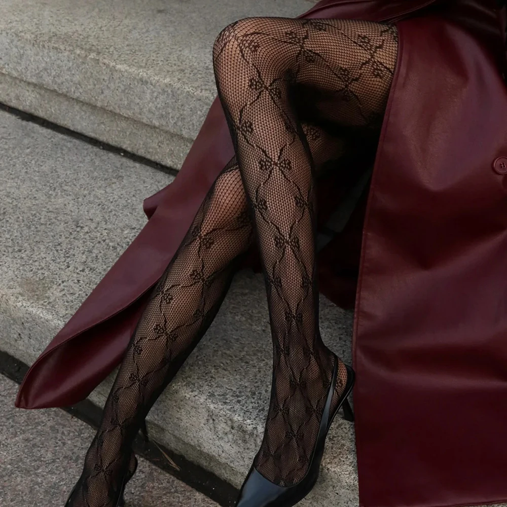 Talenza Black Pantyhose Women's Hollow Lace Fishnet Stockings Retro Floral See-through Tights Y2k Party Summer Pantyhose