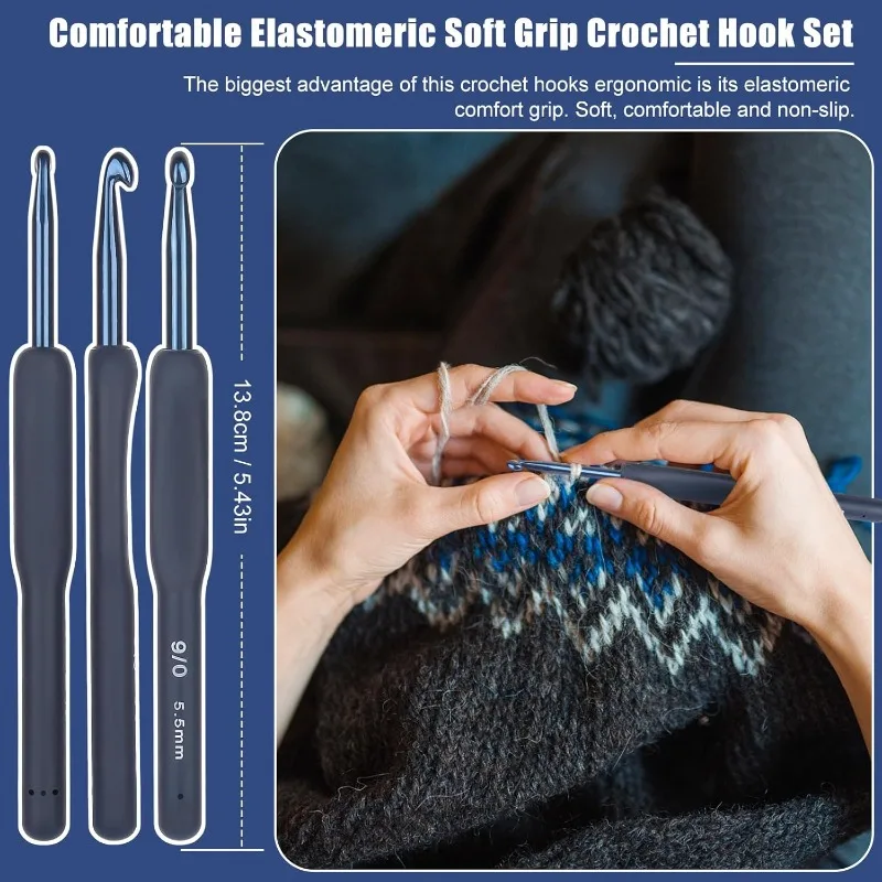 9pcs Dark Blue Crochet Hooks Ergonomic Soft Grips, 9PCS Crochet Set Aluminum Crochet Needle for Beginners/Professionals