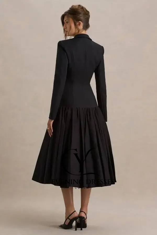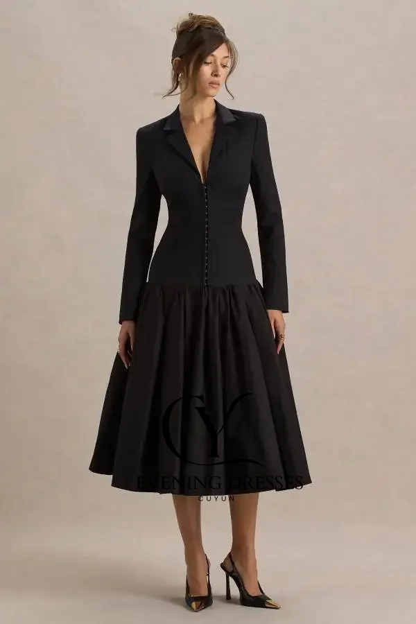 CUYUN Women Black Party Dresses Suit Jacket Dresses Notch Lapel Long Sleeves Tea-Length Prom Gown Customized Office Lady Wear