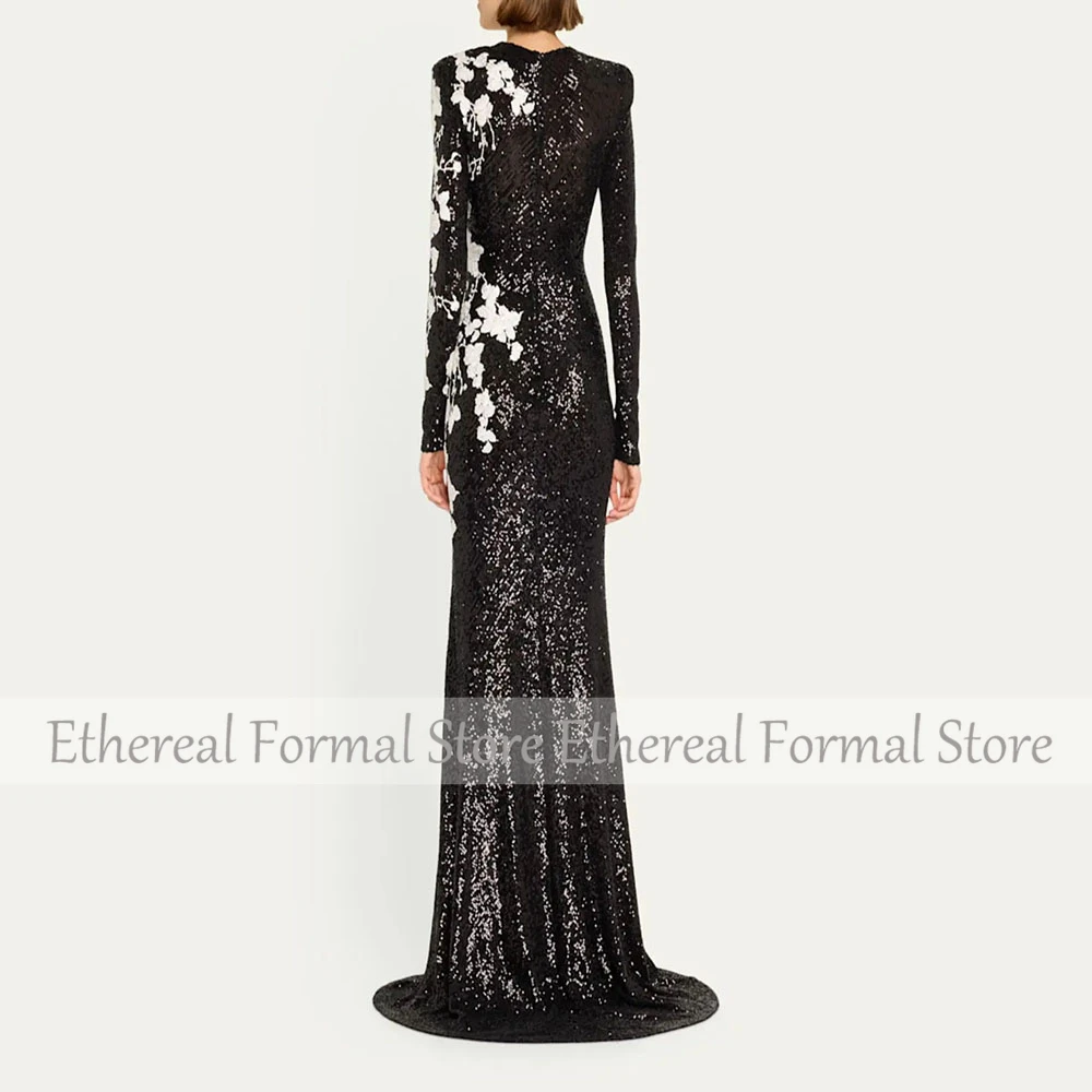 Modern Black Women's Evening Gown Mermaid Floor Length Formal Party Dress O Neck Appliques Saudi Dress Lonf SleevesProm Dress