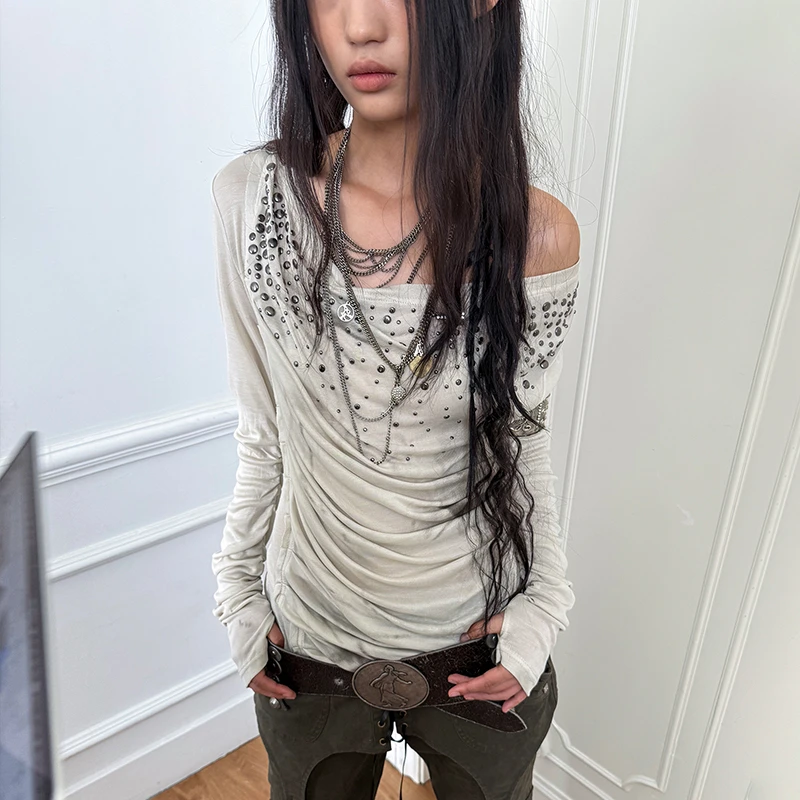 Karrcat Grunge Aesthetics Off Shoulder Tops Trashy Y2k Diamonds Print T-shirt Vintage 2000s Style Streetwear Punk American Retro