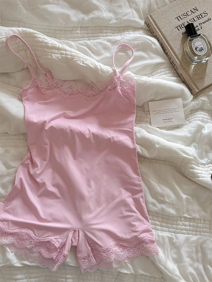 Lace Trim Slim Playsuits Woman High Elasticity Adjustable Strap Skinny Bodysuit Solid Fashion Streetwear Smooth One-piece Tops