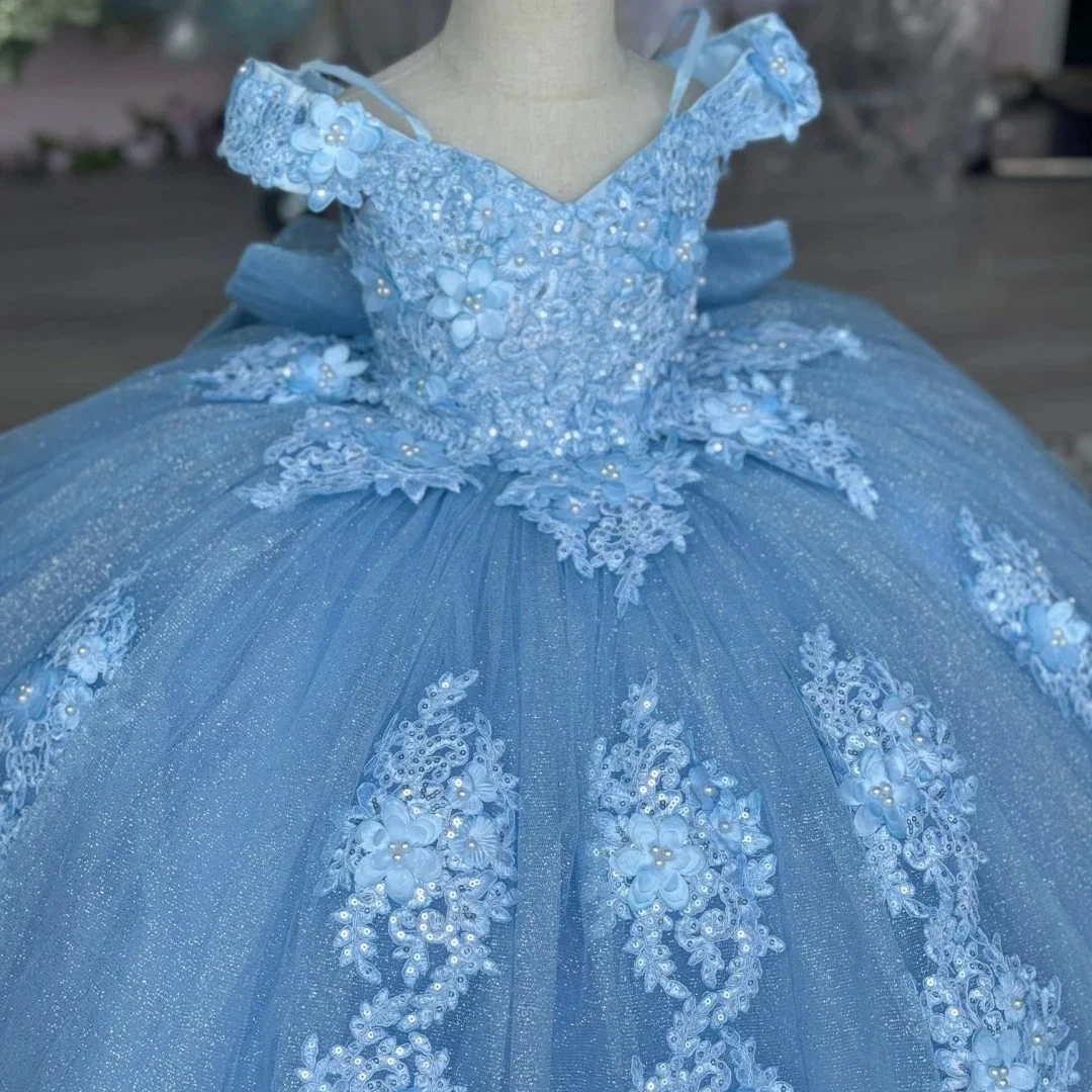 Customized Blue Flower Girl Dress For Wedding Floor Length Appliques Sequins With Bow Luxury First Communion Banquet Ball Gown