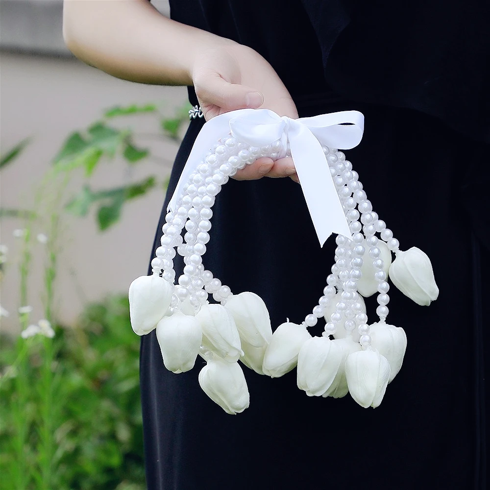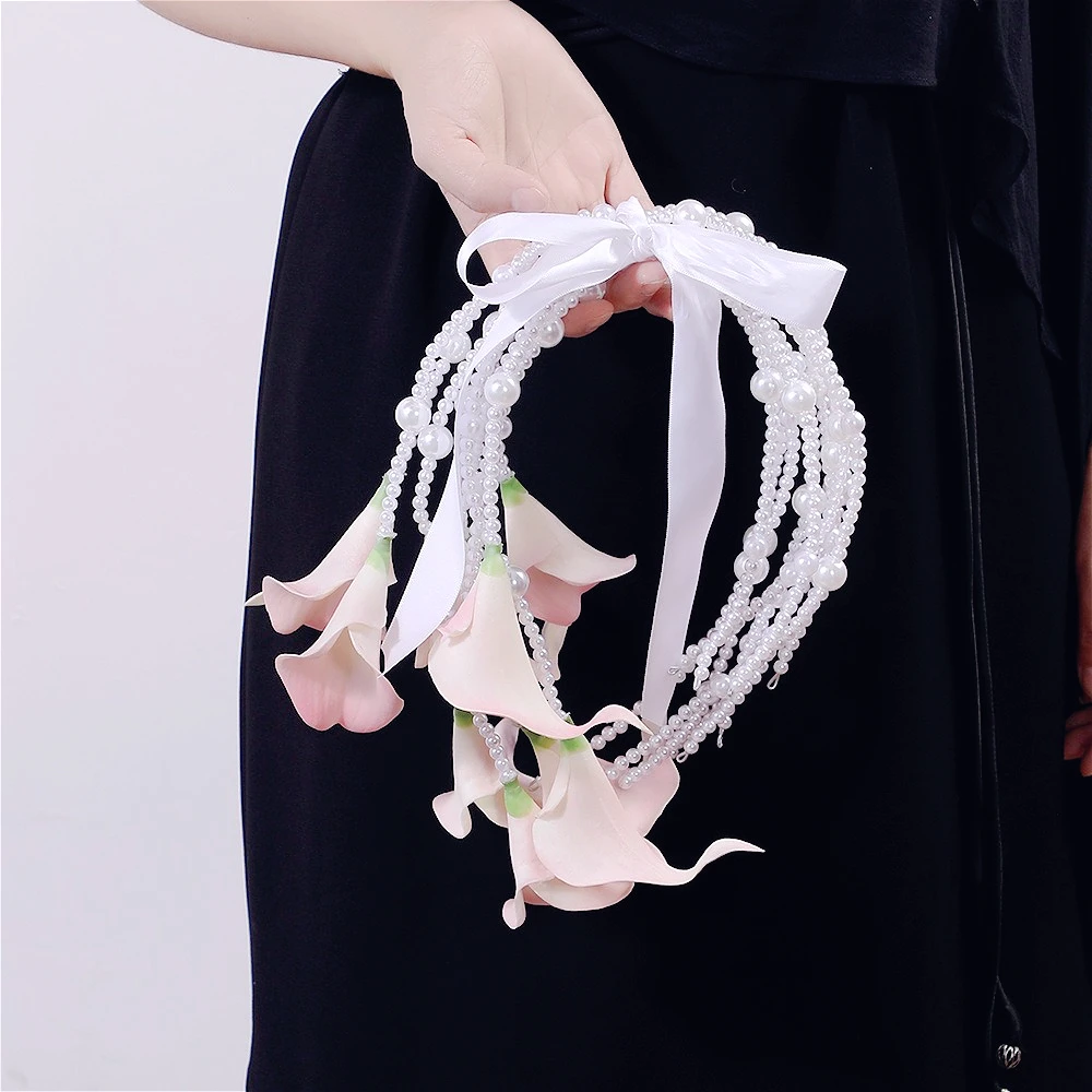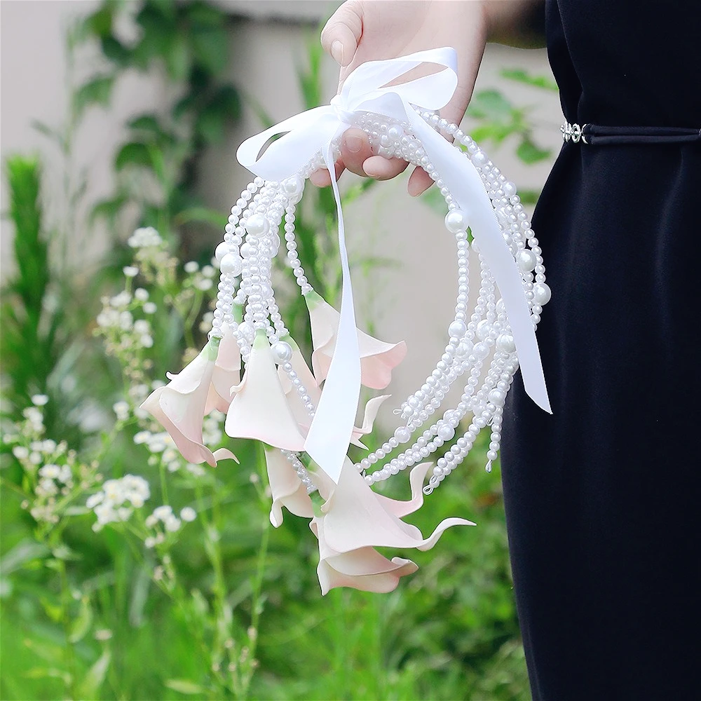 European Calla Lily Bridal Bouquet Pearl Chain Waterfall Style for Wedding Ceremony & Photography Prop Wedding Accessories