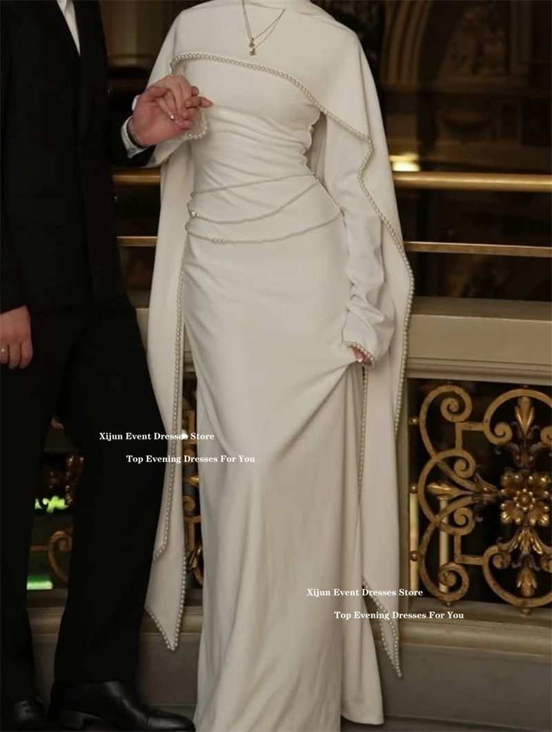 Xijun Ivory Crepe Pearls Prom Dresses Cape Full Sleeves Long Mermaid Wedding Dresses Formal Luxury Dubai Prom Gowns Customized