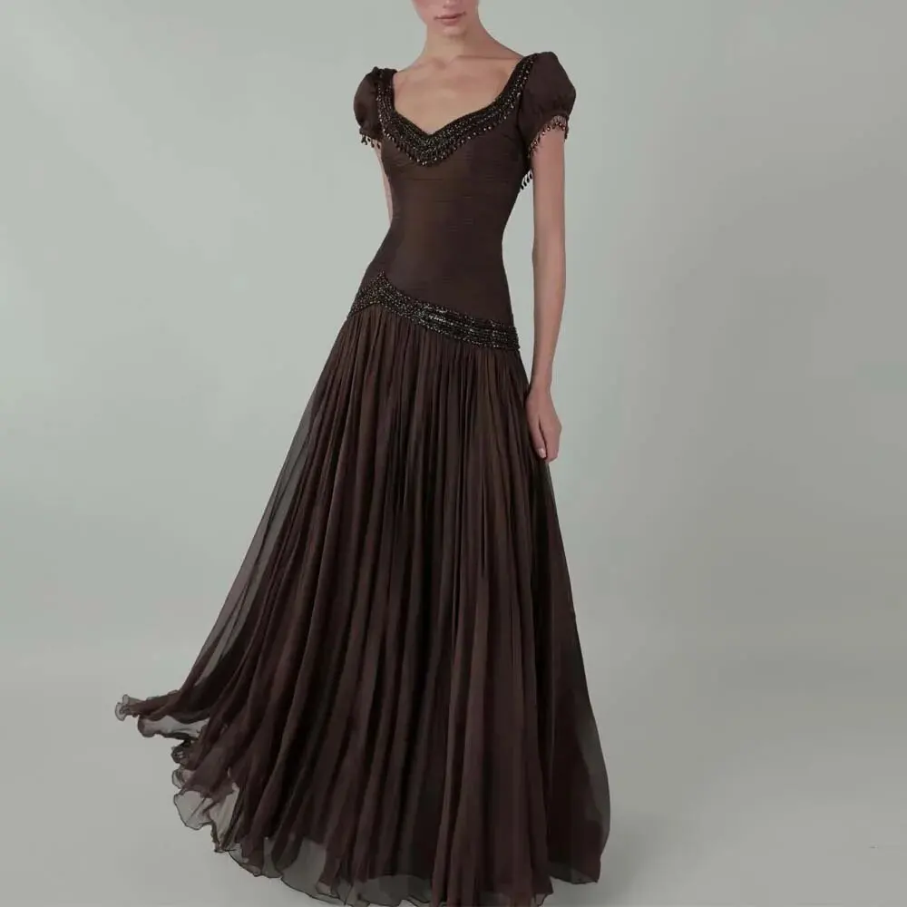 Customized Drop Beaded Evening Dresses Cap Sleeve A Line Maxi Dress with Pleated Draped Long Semi Formal Occasion Gown