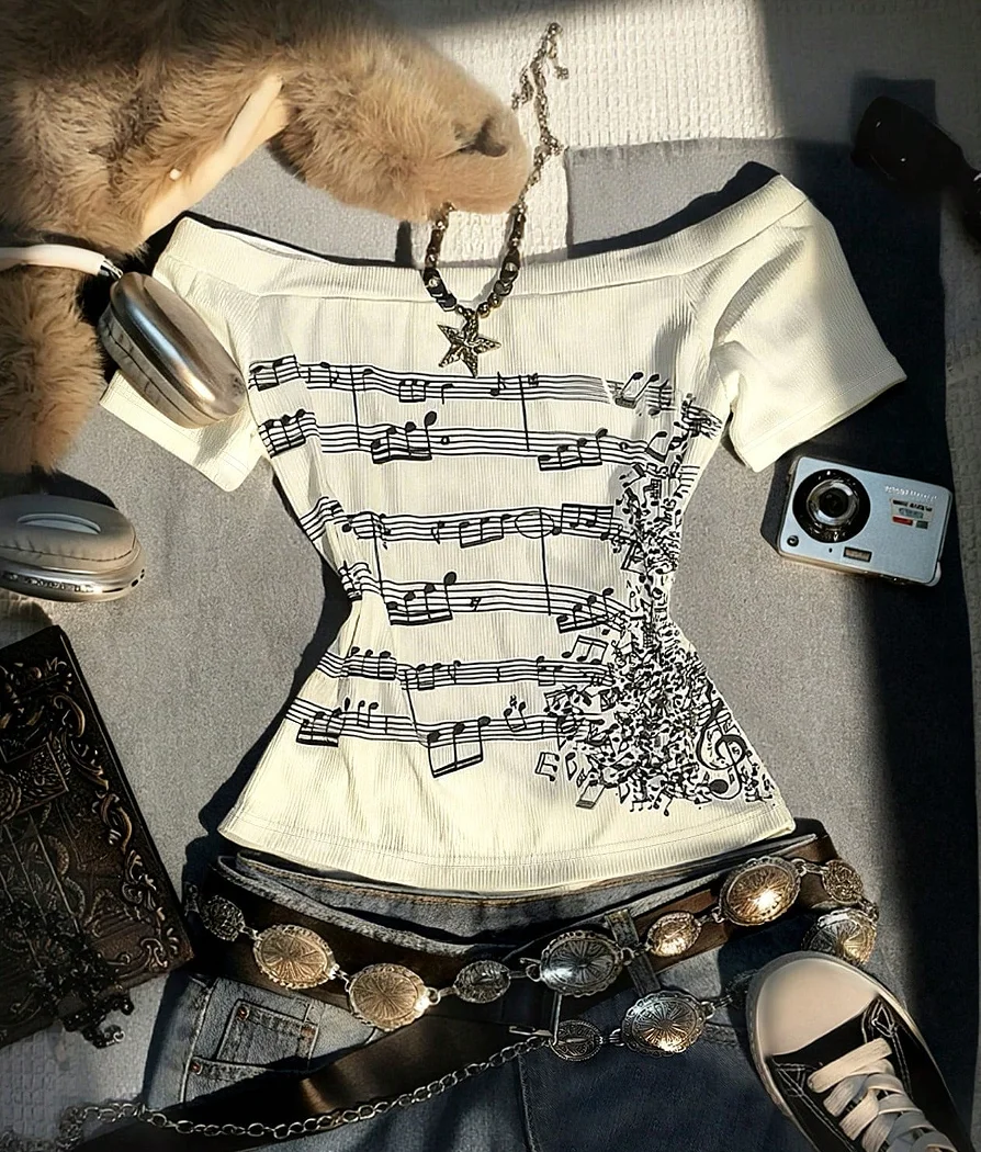 ALI shop - rezultati pretrage ... ... Women's Retro Off-Shoulder Long-Sleeved Slim-Fit T-Shirt, Adorned With Musical Note Print, Fashionable, Y2K Retro Style, High-Qu ::: 2021 ::: :::