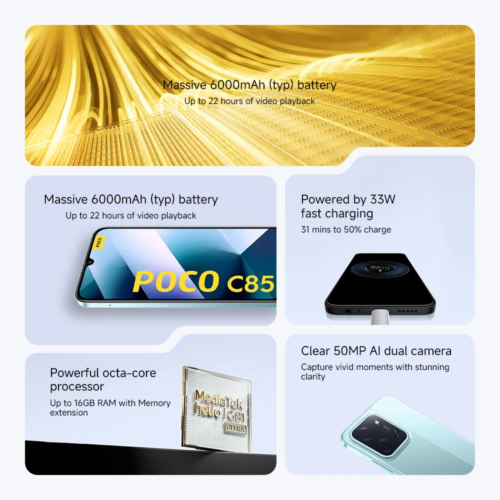 Original POCO C85 Global Version Smartphone MTK Helio G81-Ultra 6000mAh Battery 6.9'' Display 50MP Camera 33W Fast Charging NFC