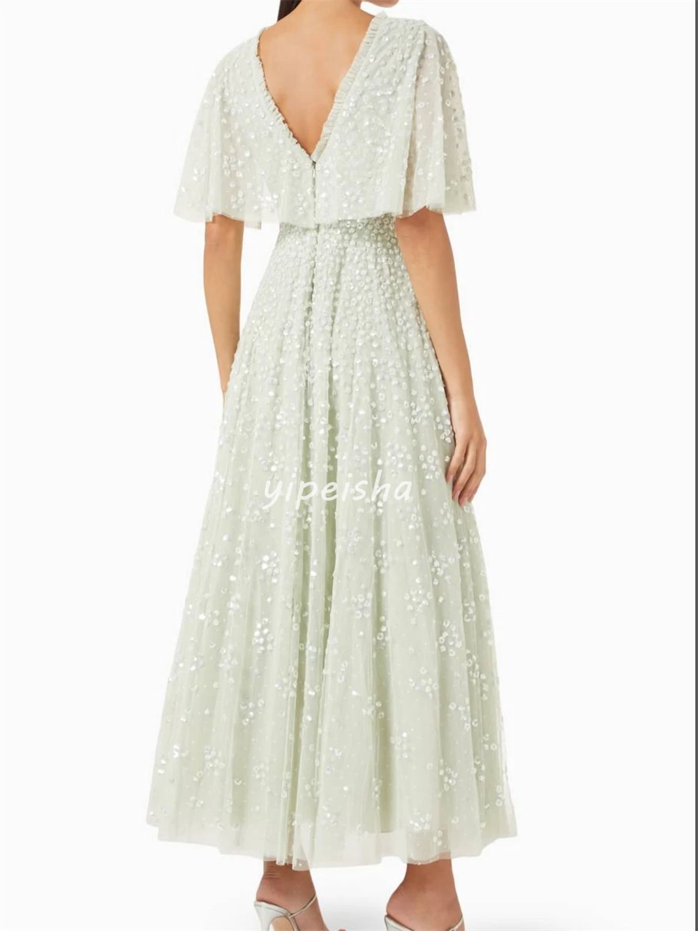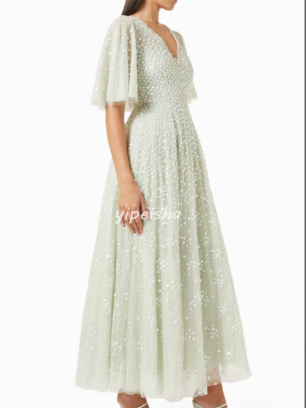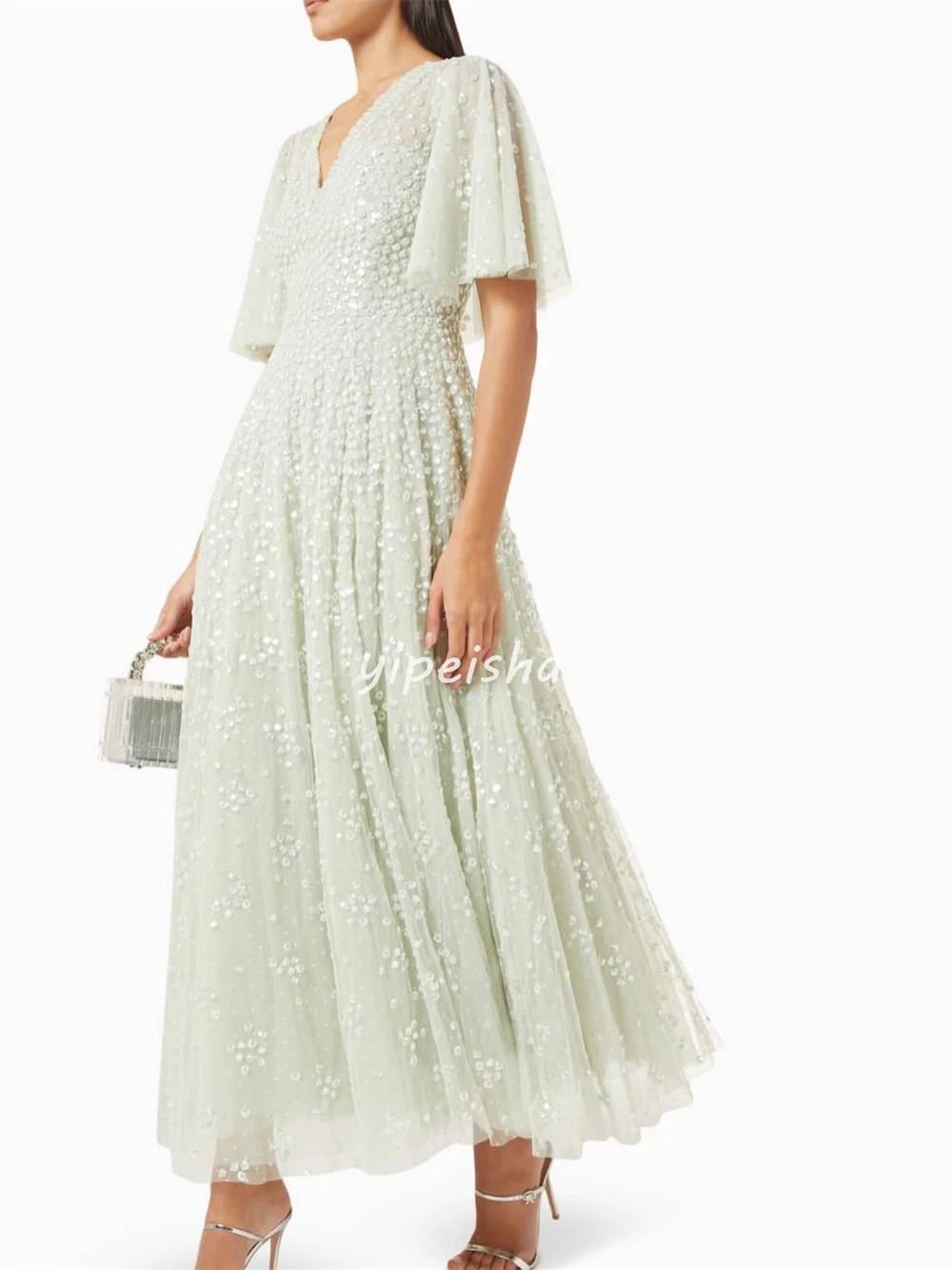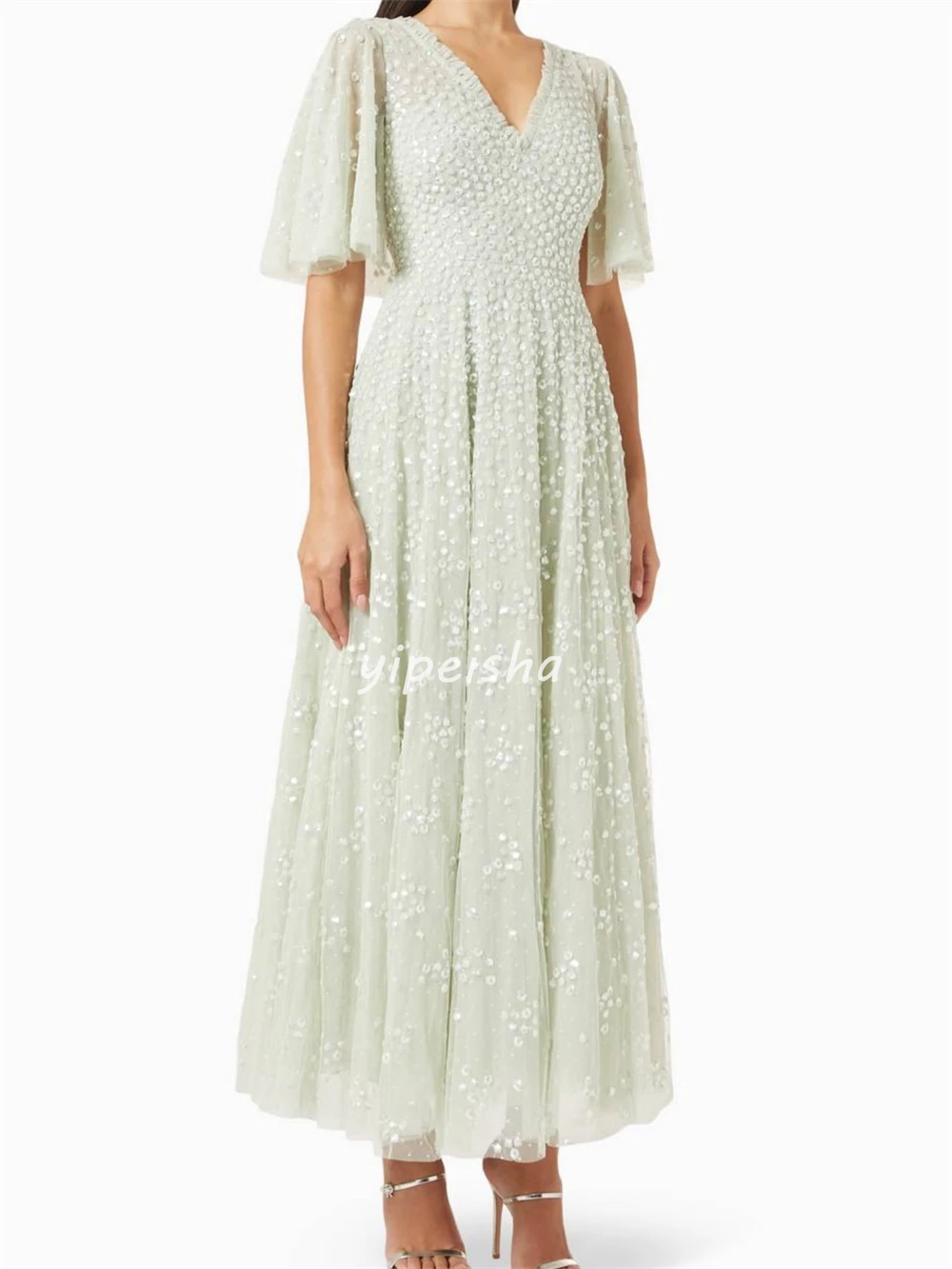 Customized Modern Style Women Tulle Flowers Sequined A-line Evening Dresses Classic V-neck Short sleeves Ankle Length Dresses