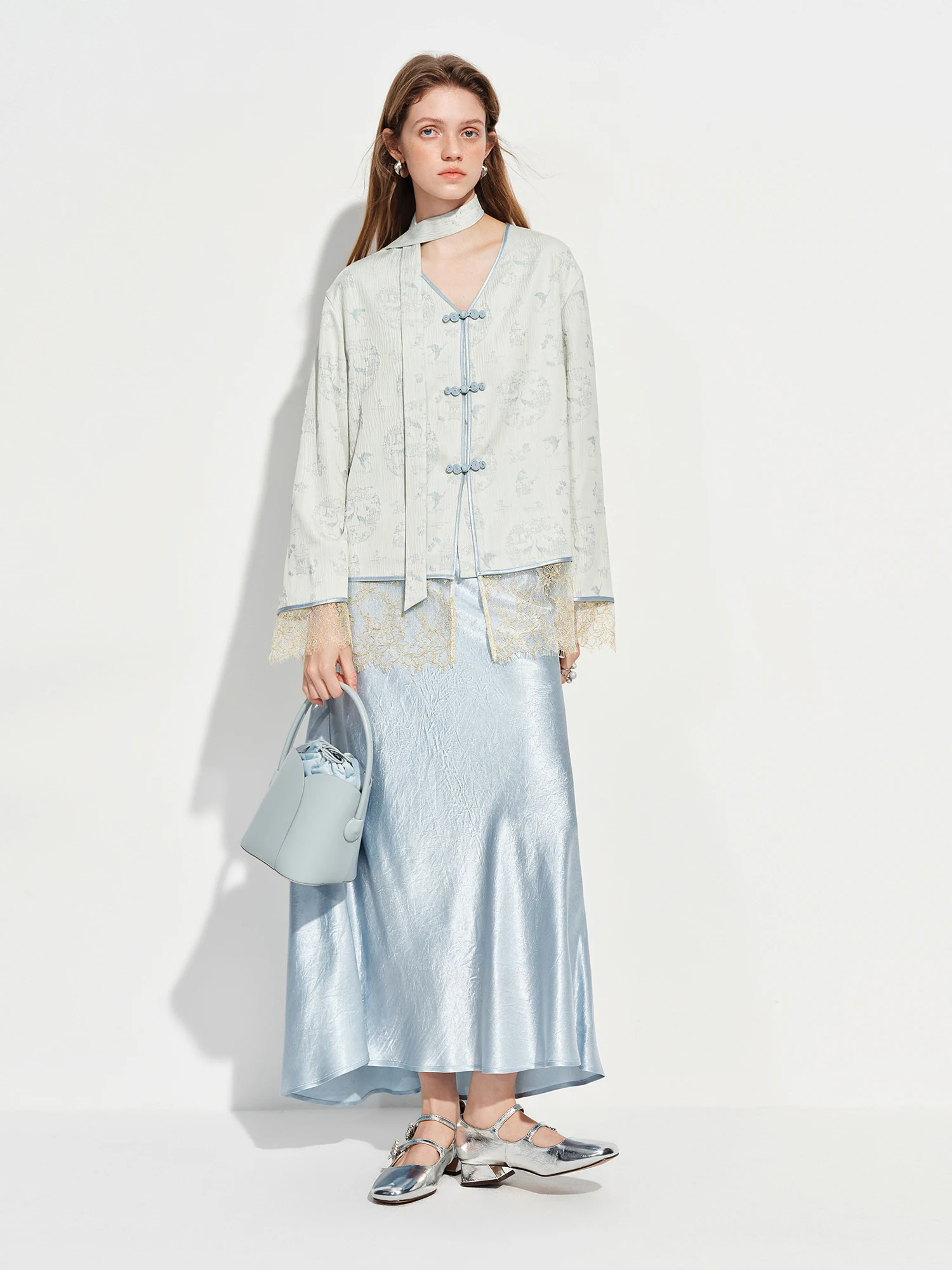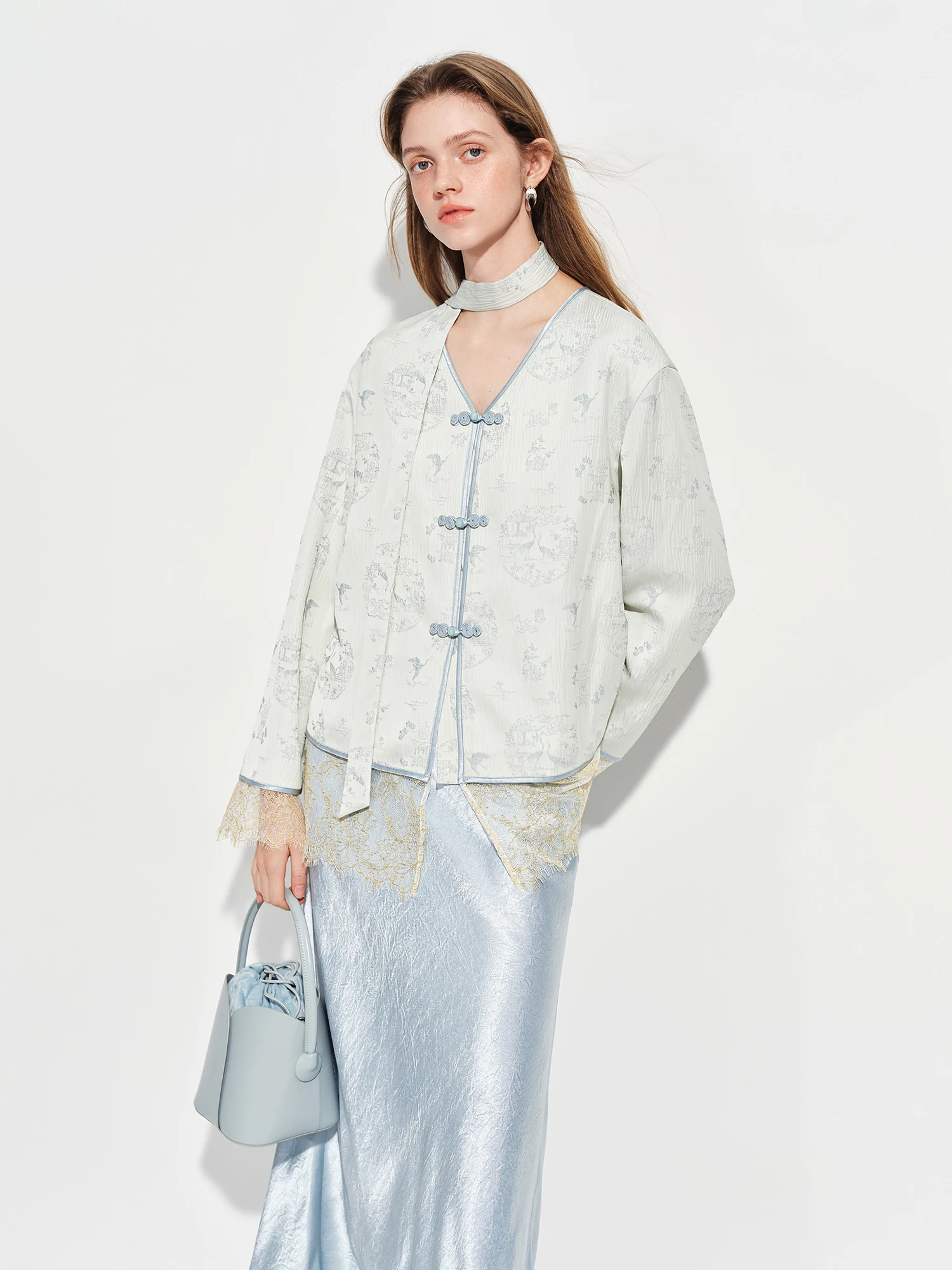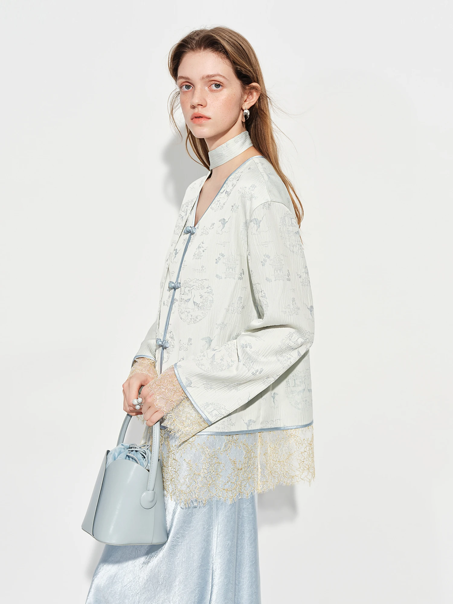FSLE Modern Chinese-inspired Women's Blazer with Button Closure Sash VNeck Patchwork Lace Trim Outerwear Spring 2026 New Arrival