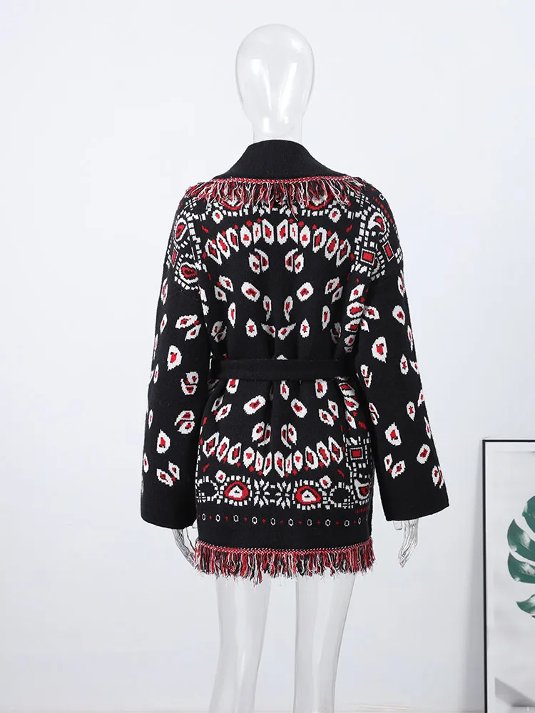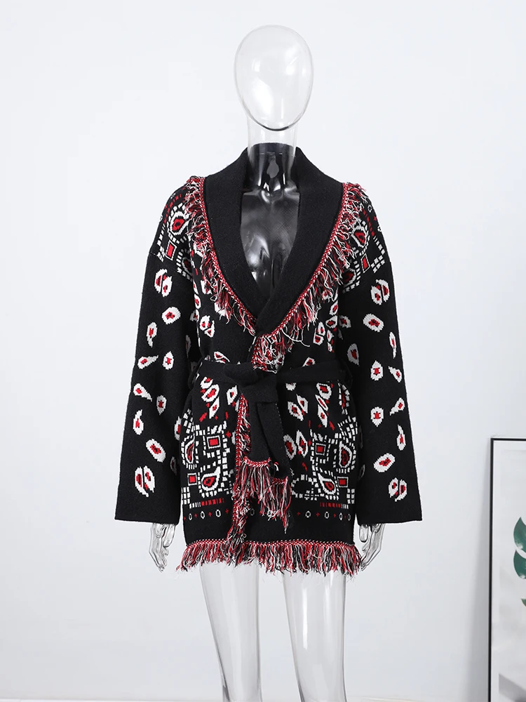 Tassel Knitted Jacquard Lace Up Cardigans Women Loose V-neck Long Sleeve Thick Lady Sweater 2025 Autumn Winter Lady Knitwear