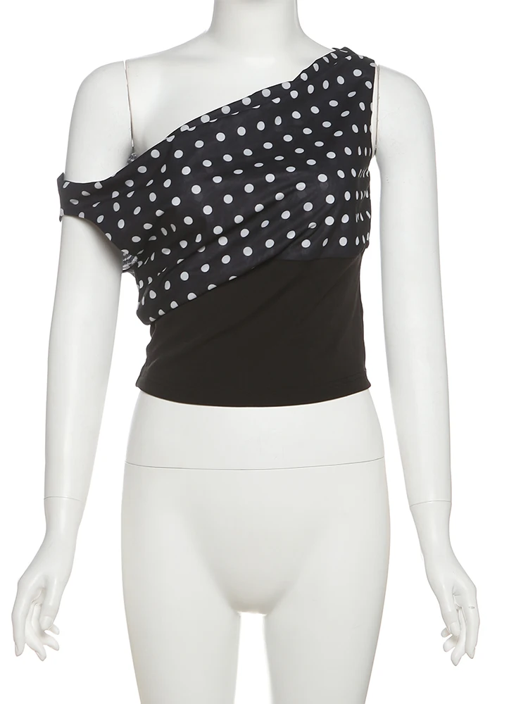 Weird Puss Polka Dots Print T-Shirts Women Summer Trend Skew Collar Off Shoulder Backless Street Fashion Trend Ruched Crop Tops