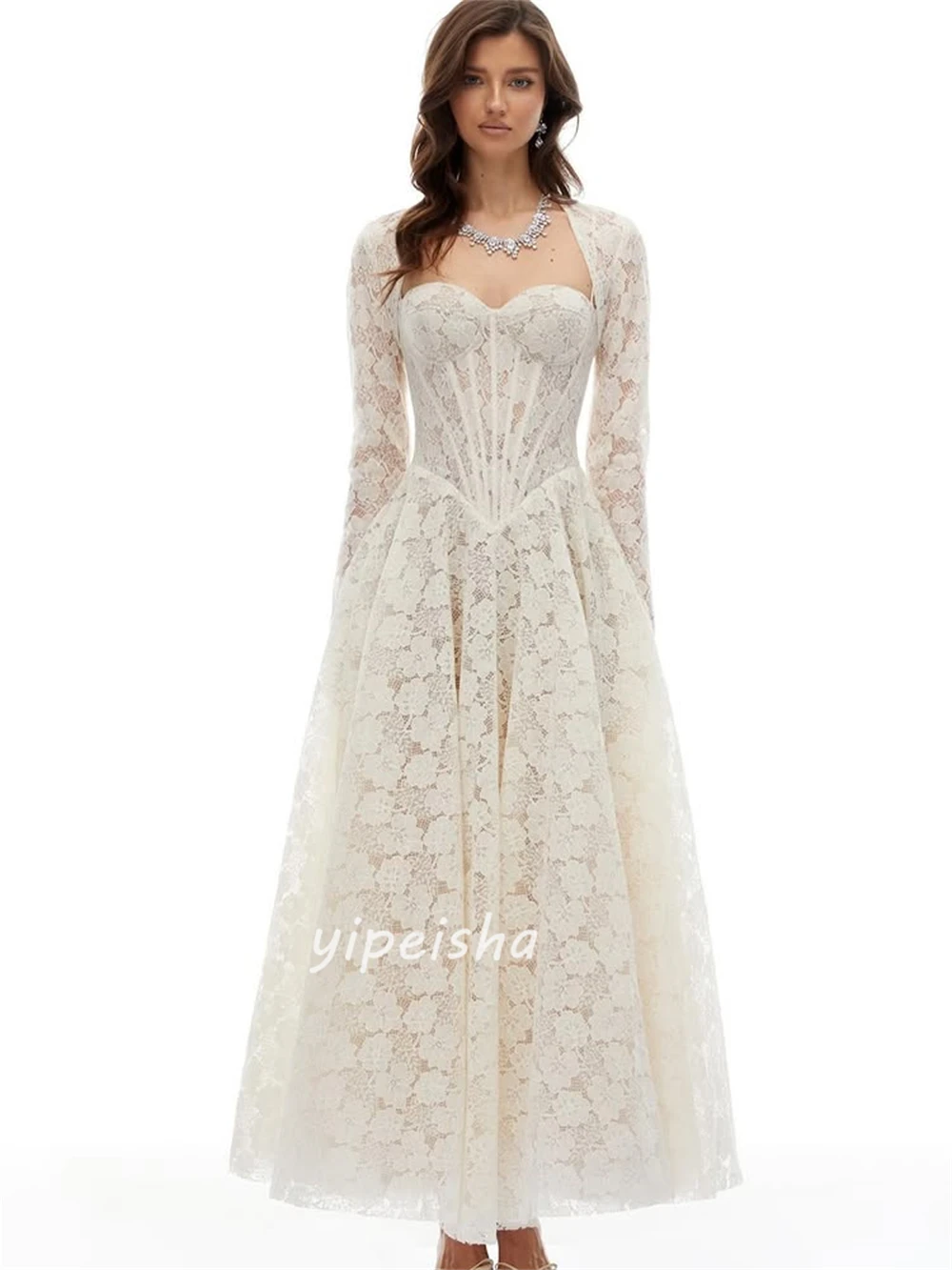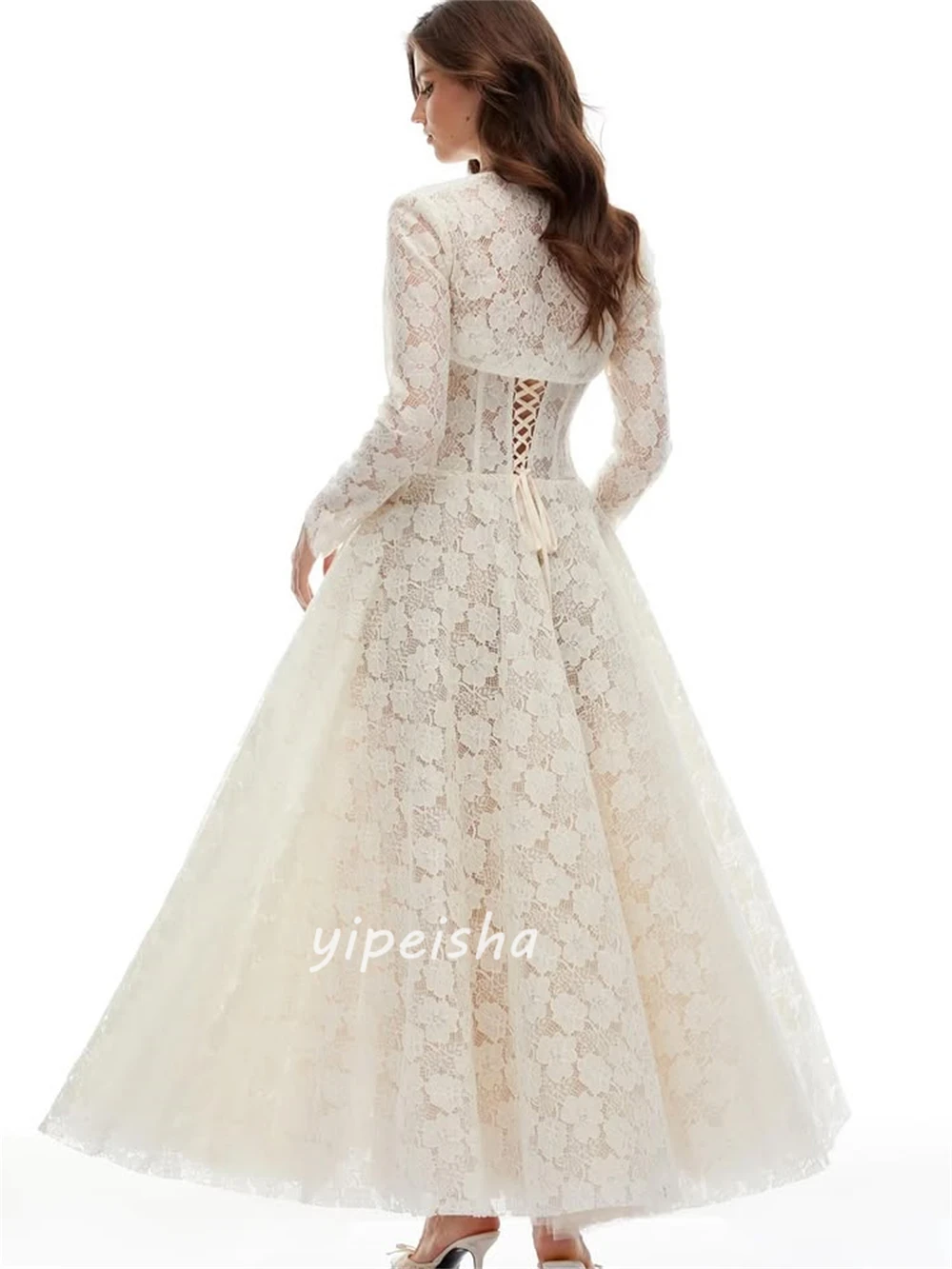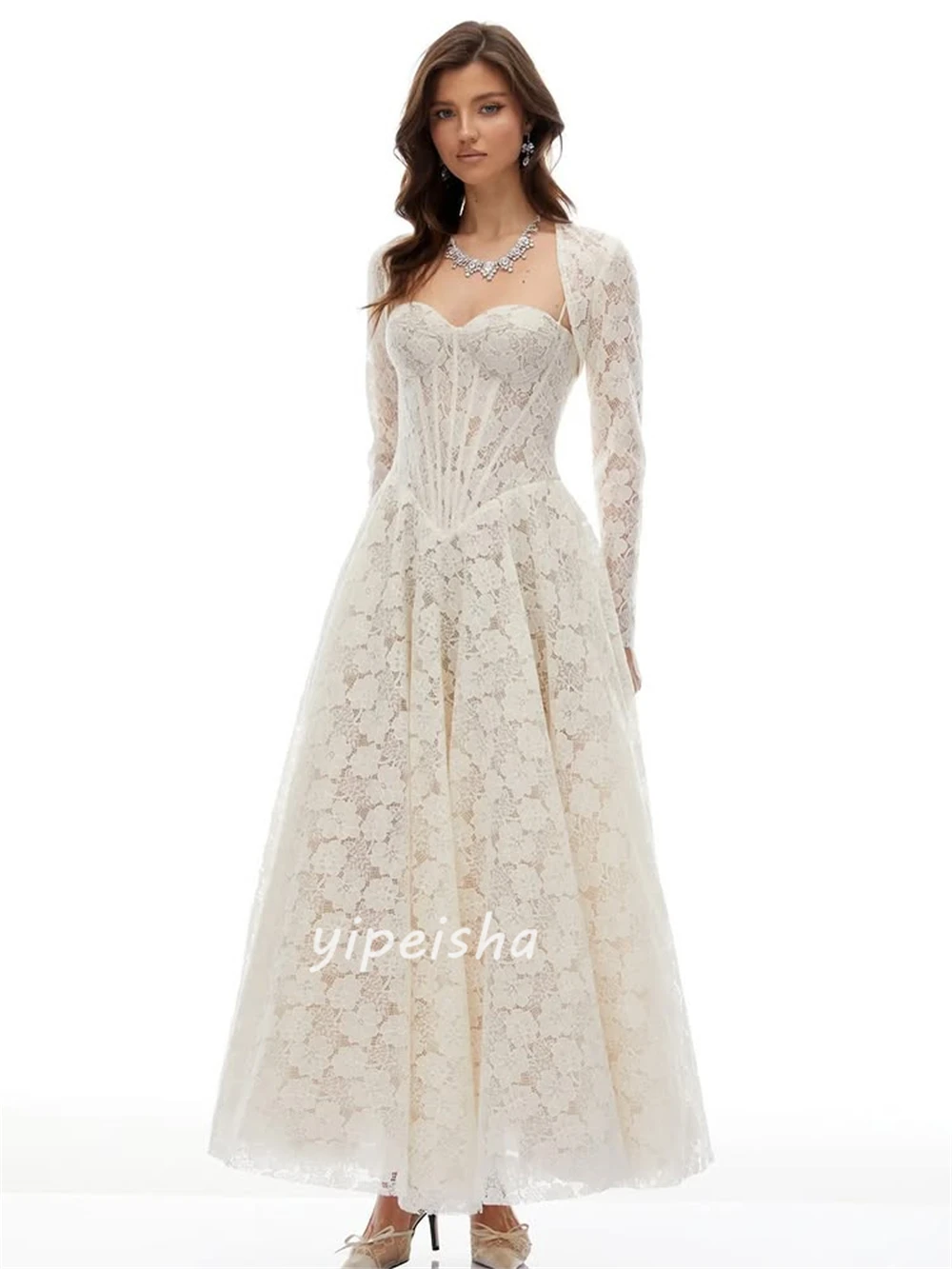 Customized Elegant Women Lace Ruched Pleat A-line Evening Dress Simple Retro Spaghetti strap Long Sleeves Ankle Length Dresses