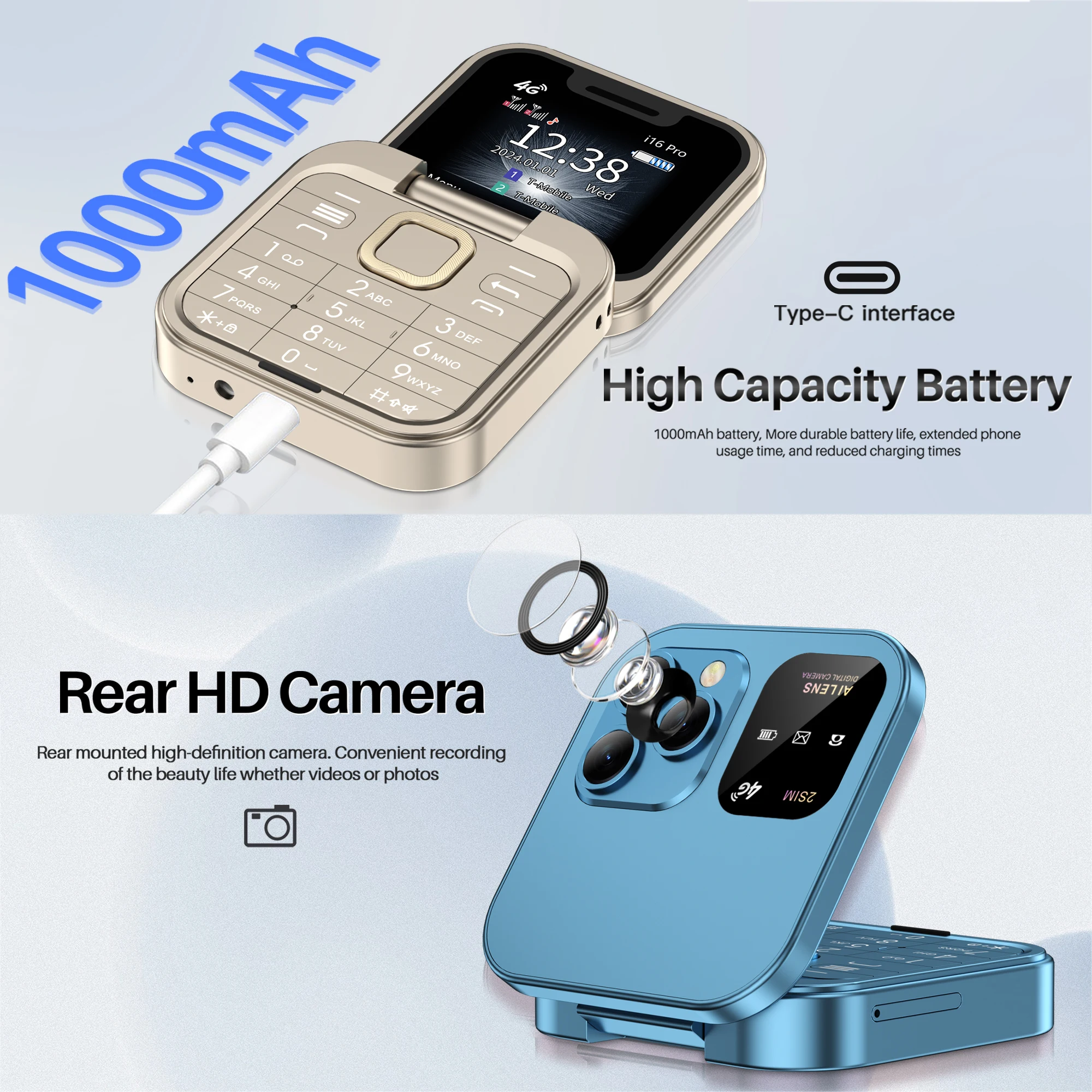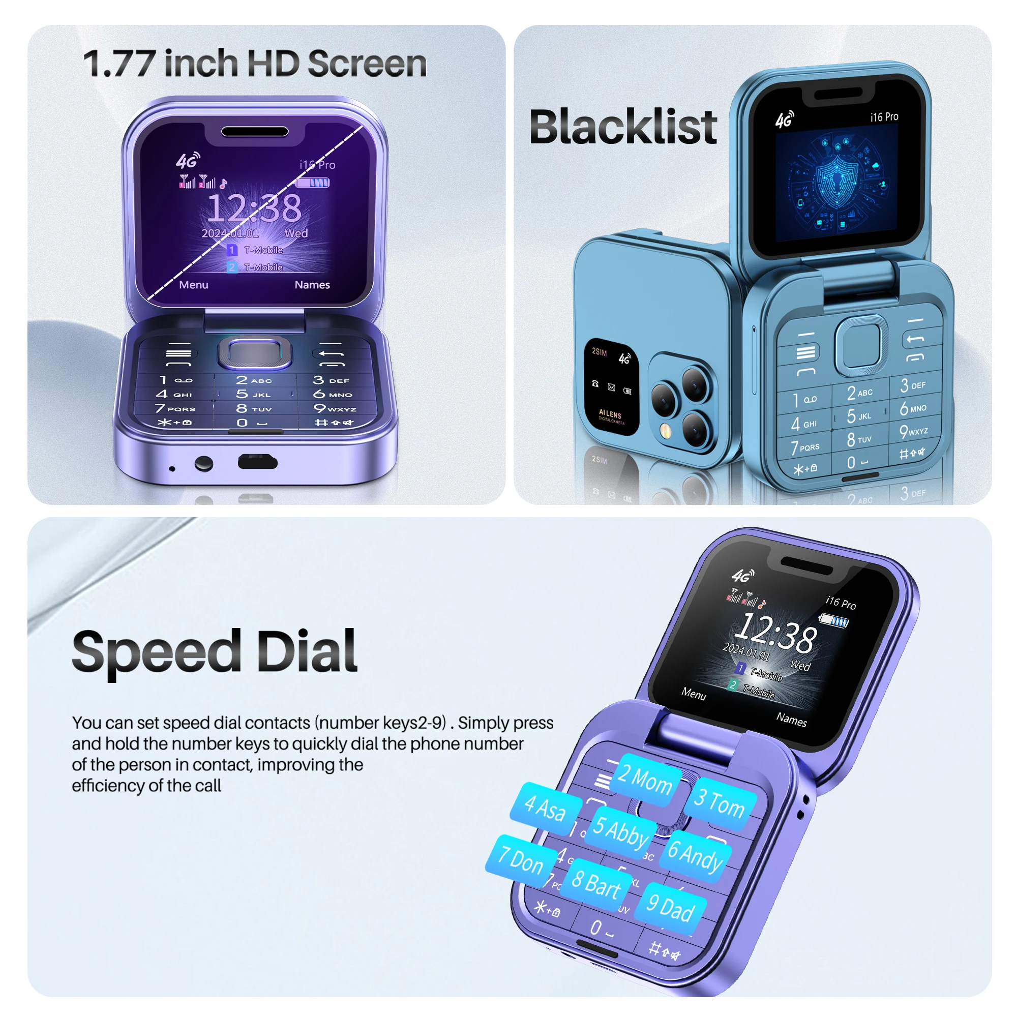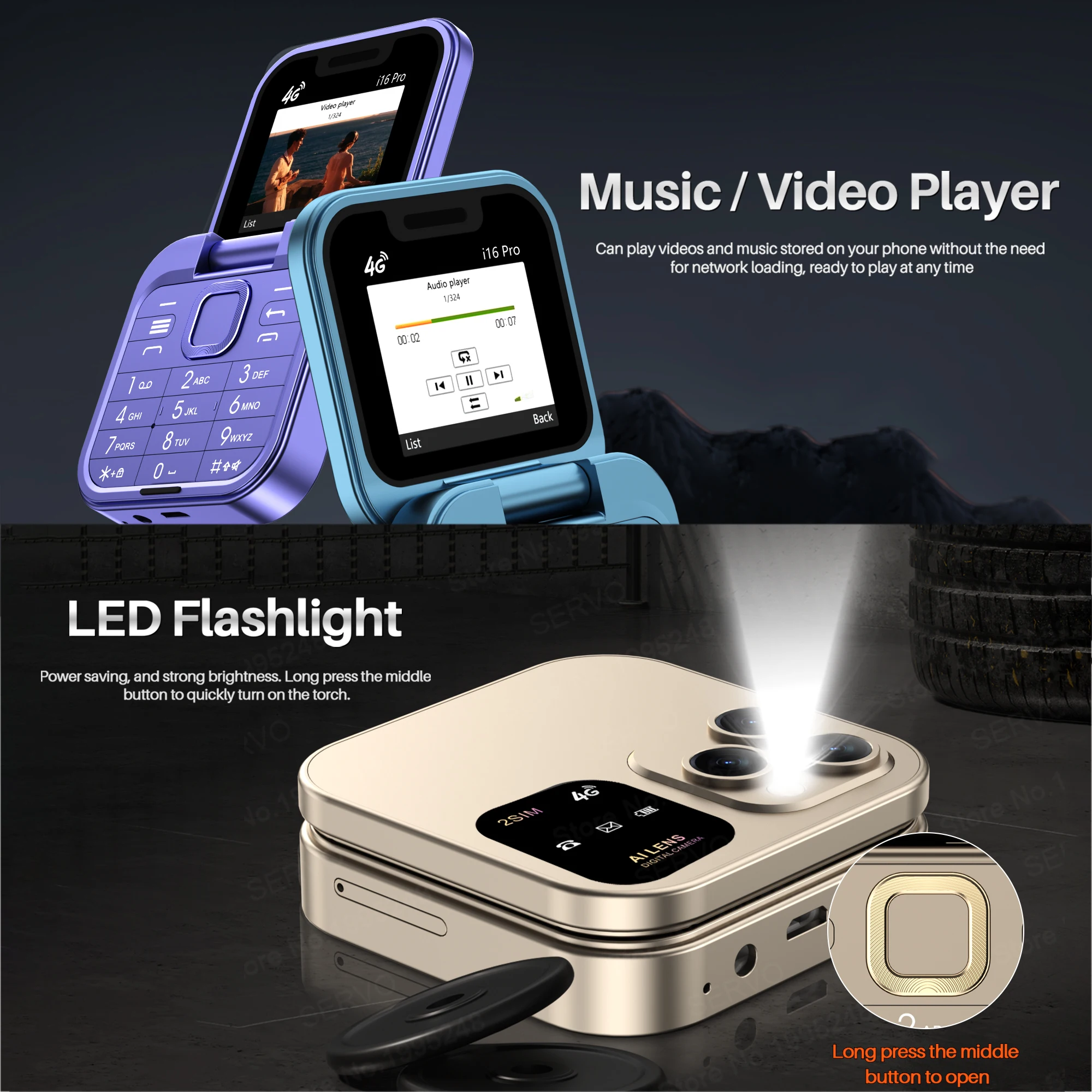 SERVO Mini Flip Mobile Phone 4G/2G Cellular 1.77'' Diaplay Speed Dial Flashlight Recorder FM Radio Dual SIM Foldable Cellphones
