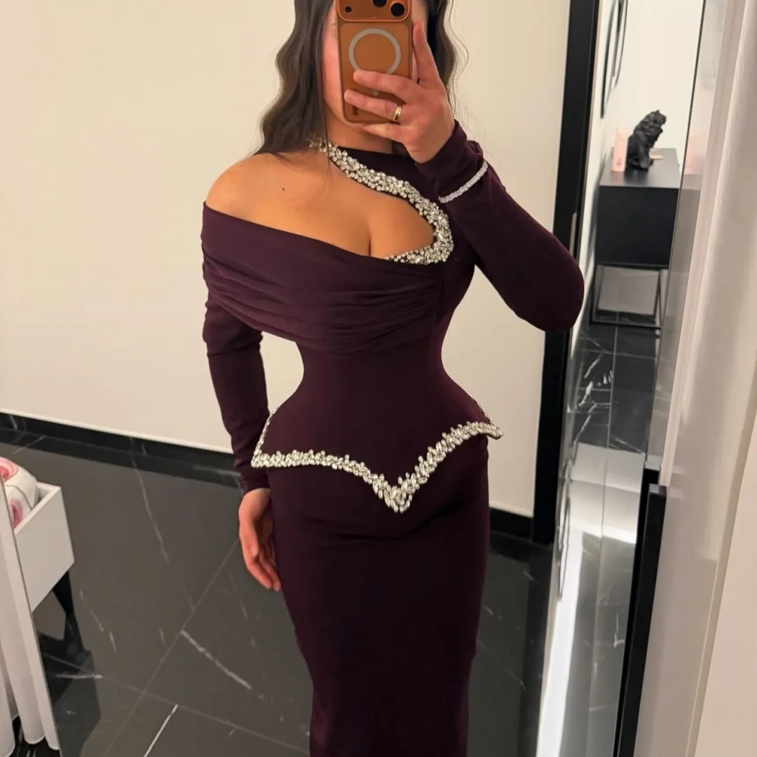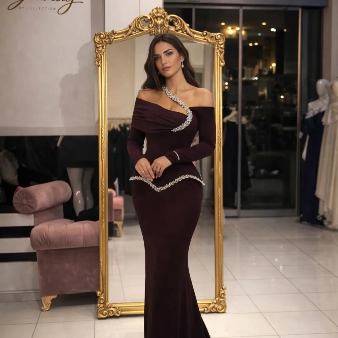 Mila Plum Off Shoulder Prom Dresses Long Sleeves Beaded Trim Mermaid Floor Length Customized Formal Evening vestidos de gala