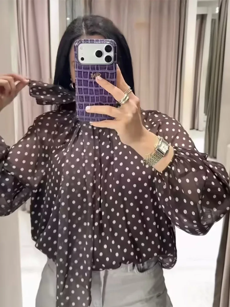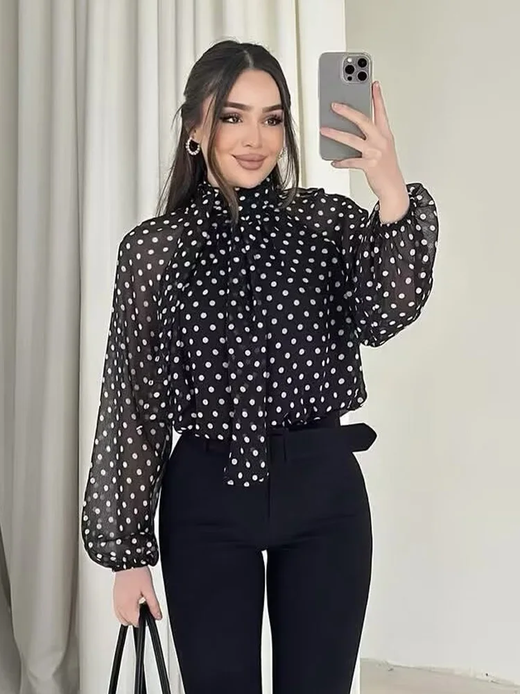 Women Polka Dot Print Blouse Casual High Collar Long Sleeve Lady Top Simple Women's Blouse Female Shirts & Blouses