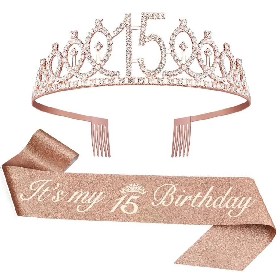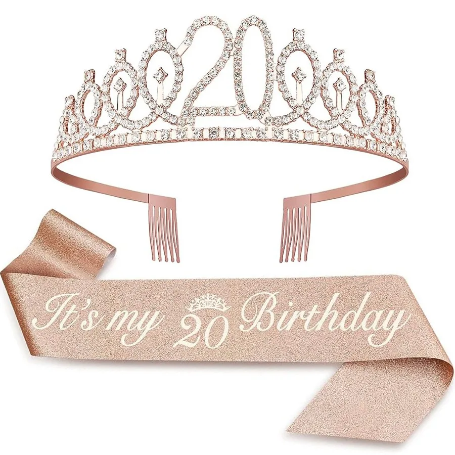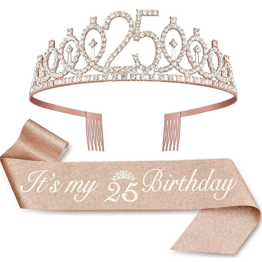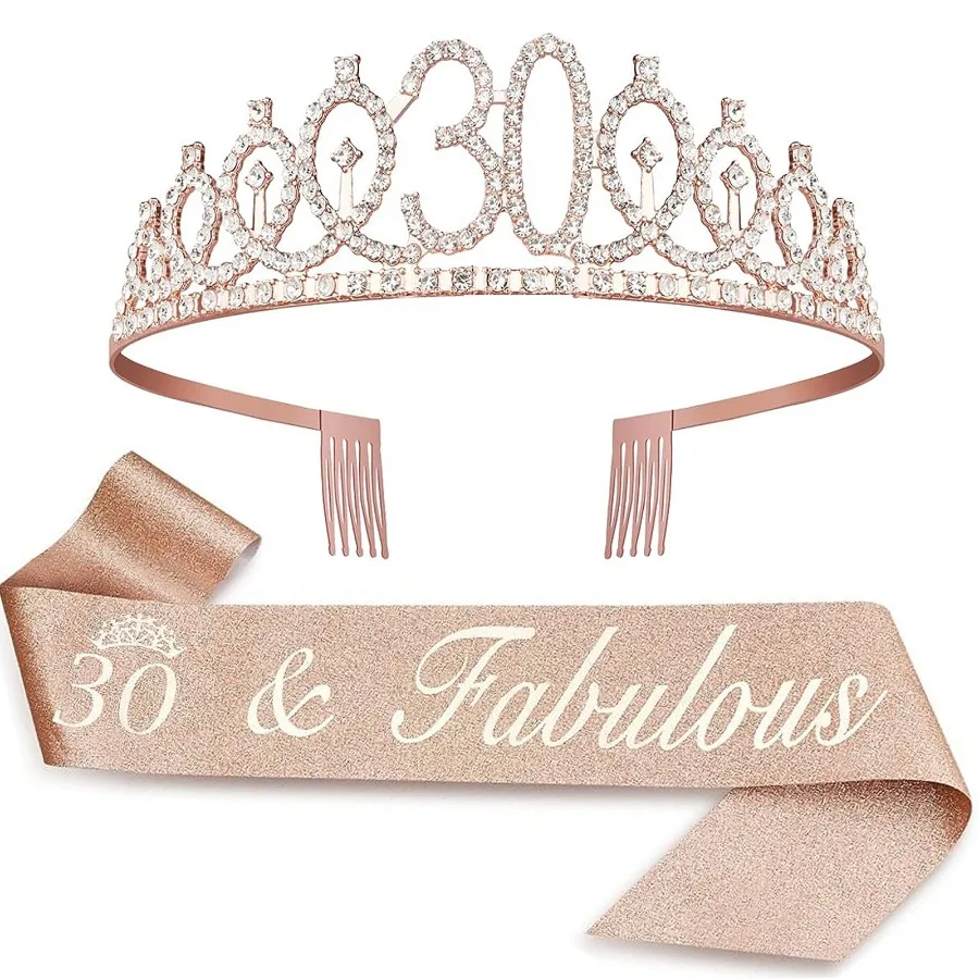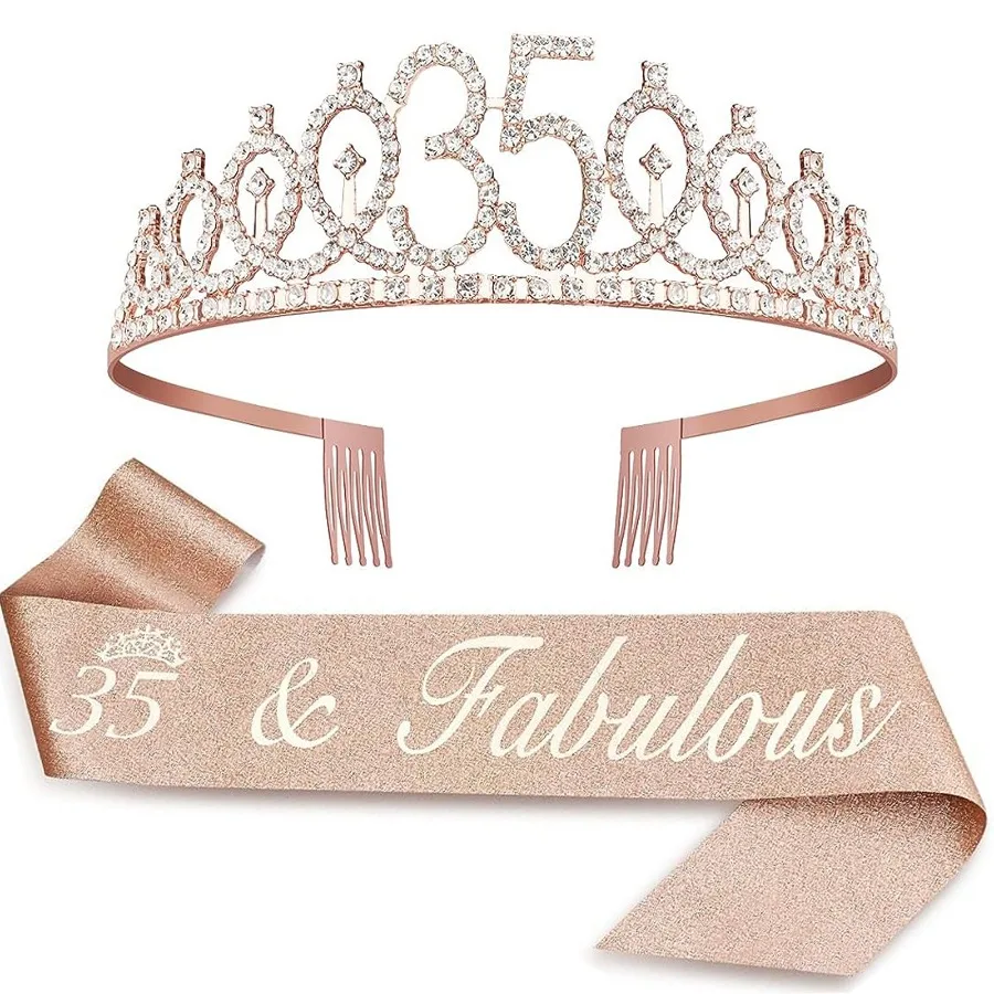Birthday Tiara Crown Sash Women Girls 15th 20th 25th 30th 35th 40th 45th 50th 55th 60th 65th 70th Party Decoration Favor Gifts