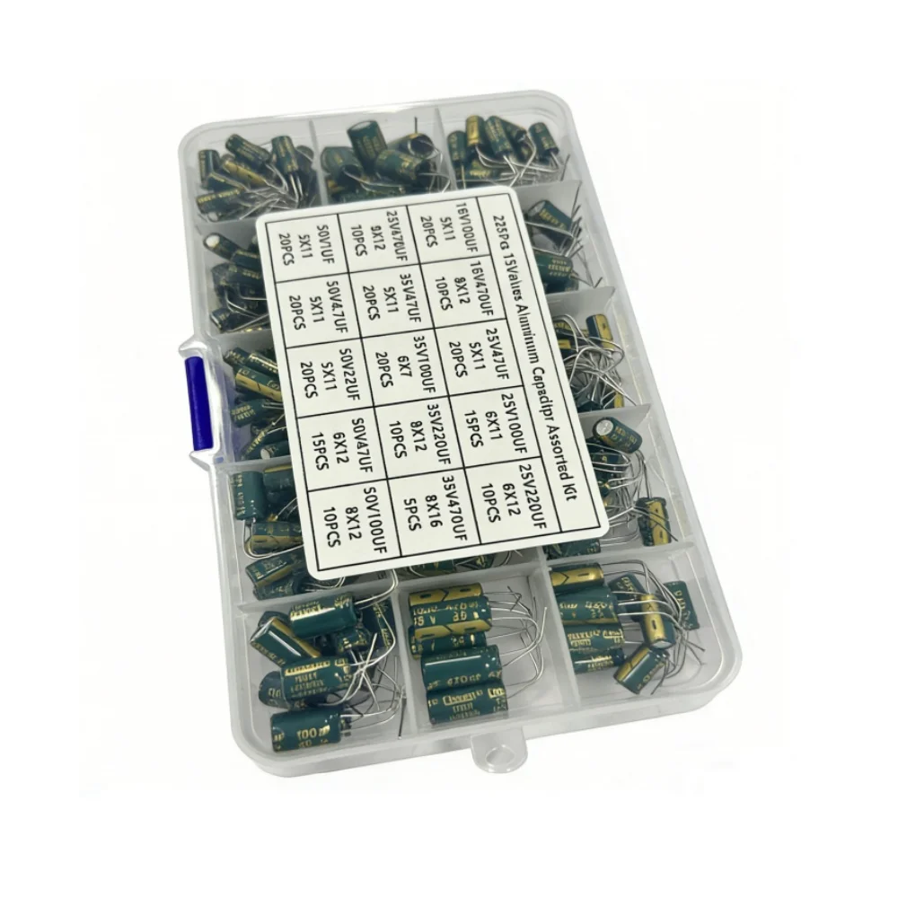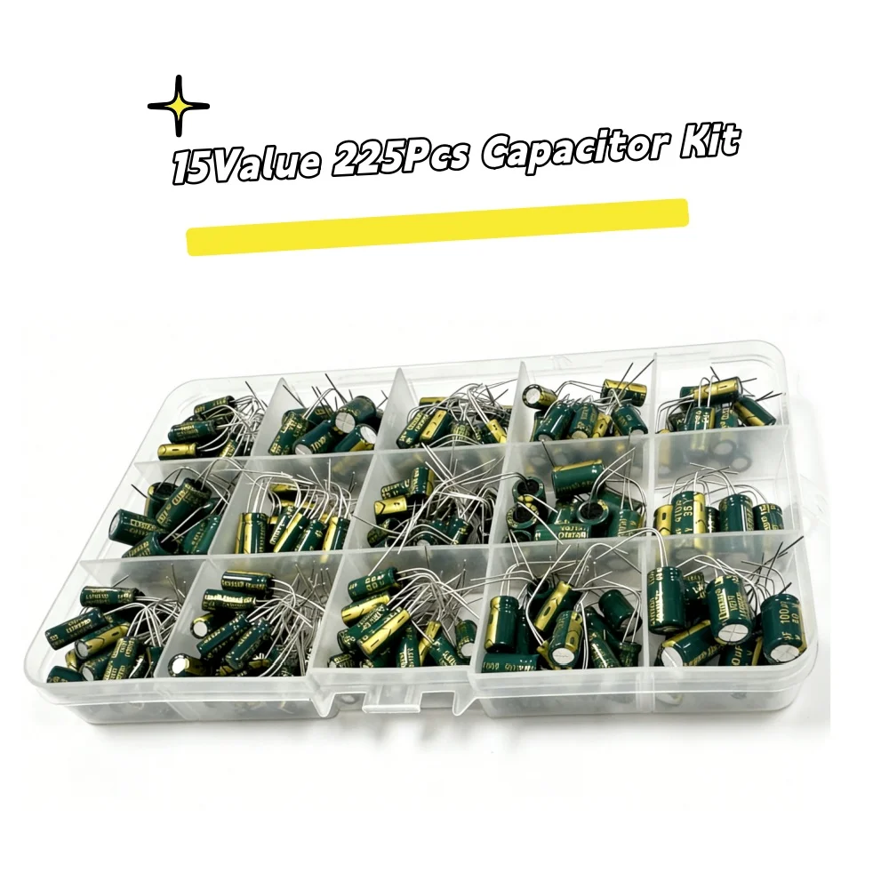 225Pcs/Box Capacitor Kit Aluminum Electrolytic Capacitors Set 15Values 16V-50V 1uF-470uF Assorted Kit Storage Low ESR