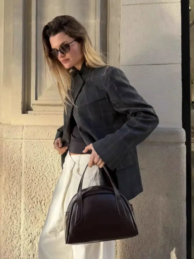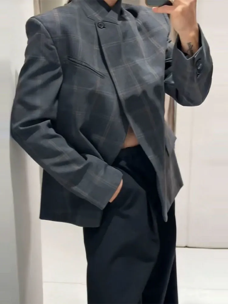 HH Women Fashion Plaid Blazer Coat Stand Collar Long Sleeve Jacket 2026 Spring Trend Casual Office Lady Chic Outerwear