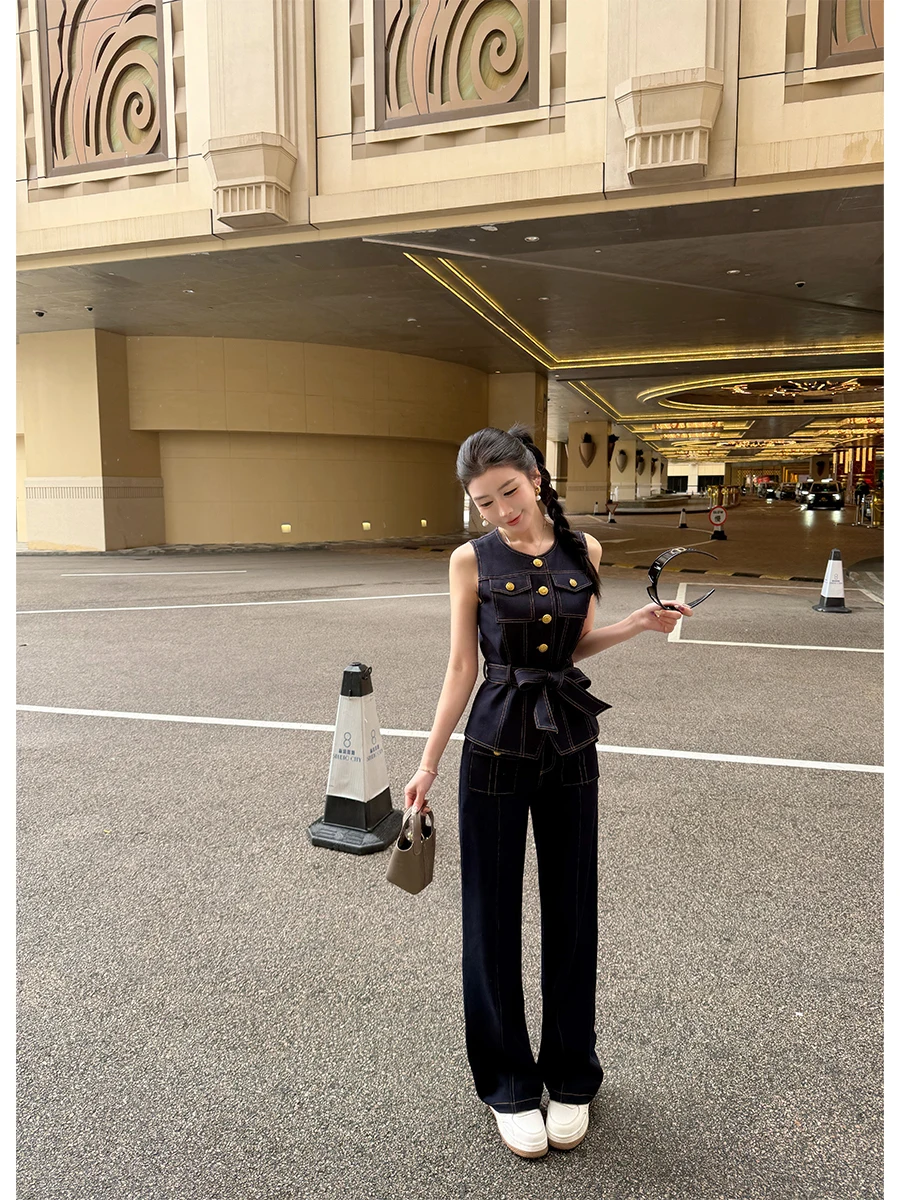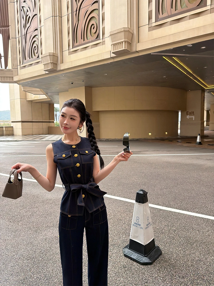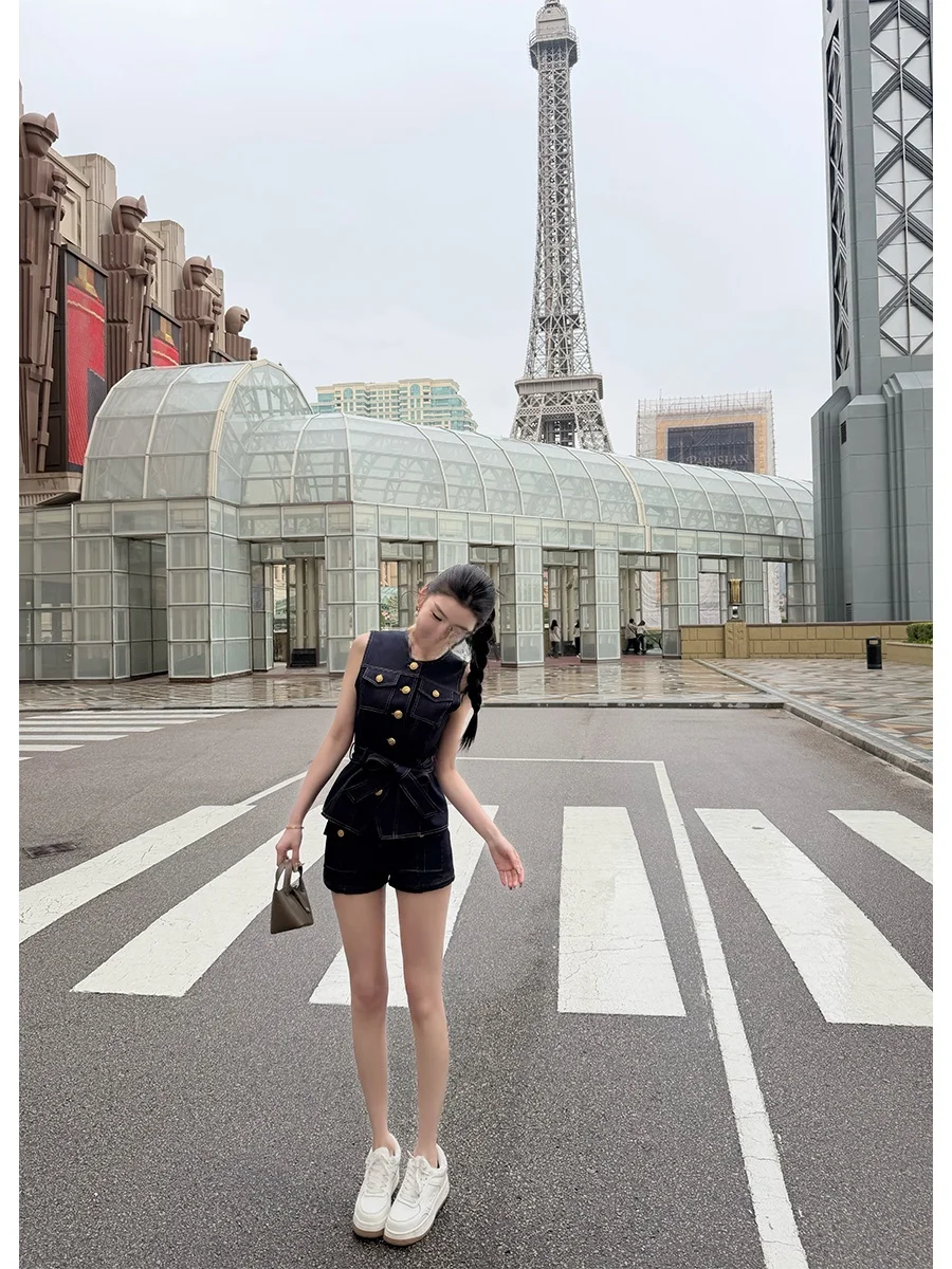 Retro Denim Vest LADIESFIRST Spring New Waist-Cinching Elegance Sleeveless Top Breathable Polyester Blend round Neck Design