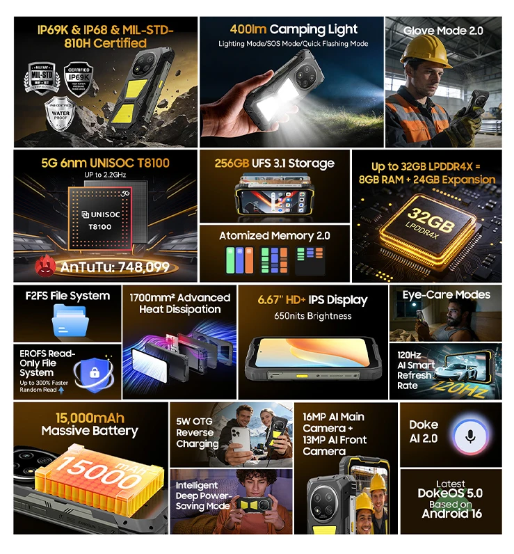 Blackview ROCK 2 Pro Rugged SmartPhone 5G 6.67 inch 120Hz IPS Display UNISOC T8100 Android 16 8GB 256GB 15000mAh NFC Cellphone