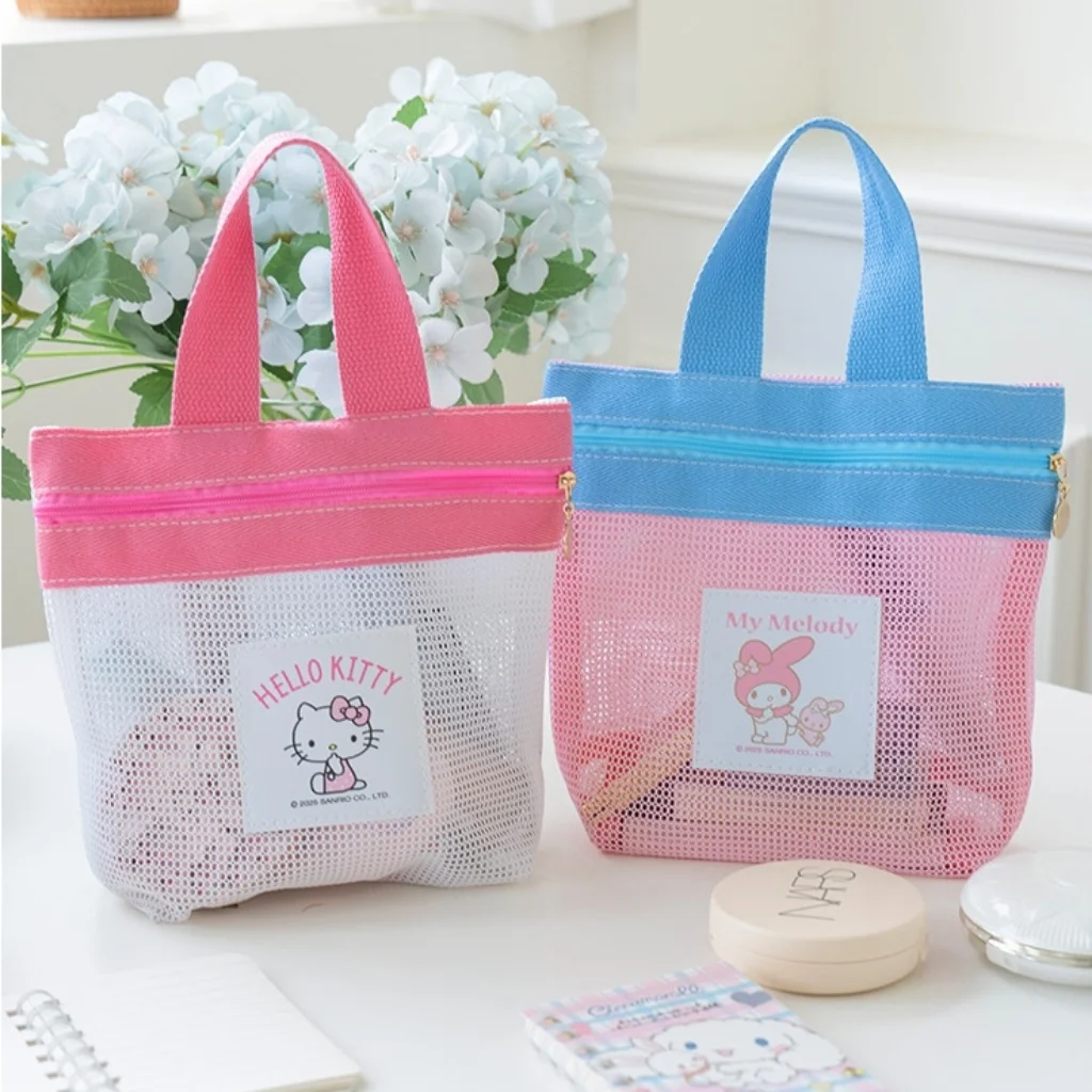 Sanrio Hello Kitty Mesh Bag Portable Tote Bag with Zipper Cute Cartoon Handbag for Women Kids Daily Use