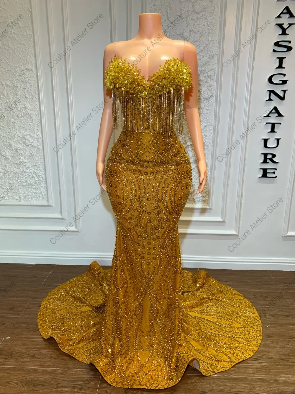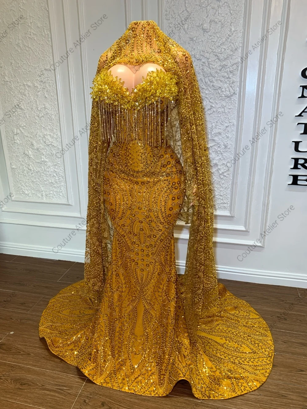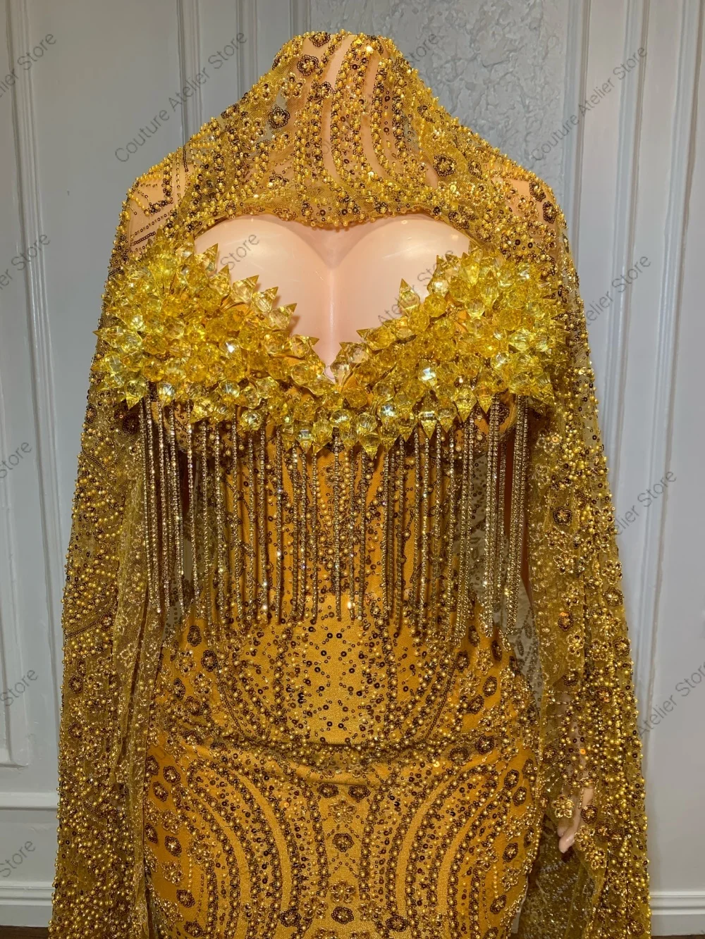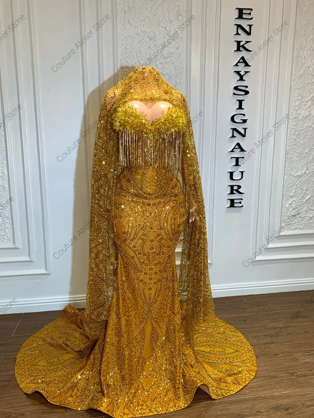 Glamorous Gold Stones Prom Dresses With Head Cover Beaded Rhinestones Mermaid African Wedding Dress Black Girls Customized