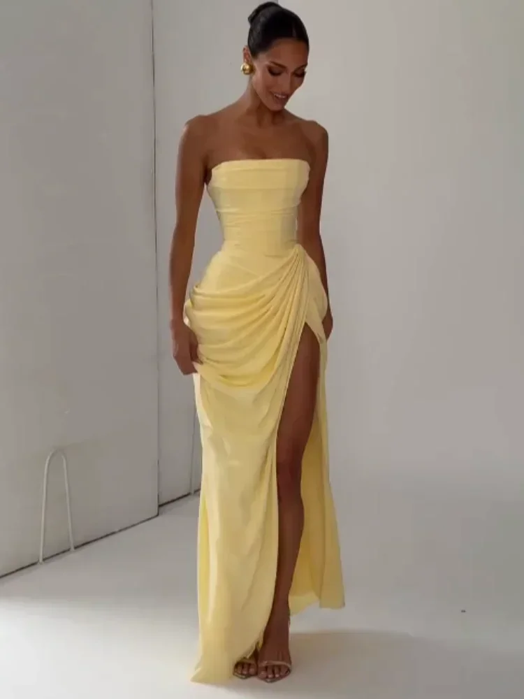 Yellow Strapless Pleated Dress Women Elegant Sleeveless Waist Cinching Split Maxi Gowns 2026 Lady New Evening Party Dresses