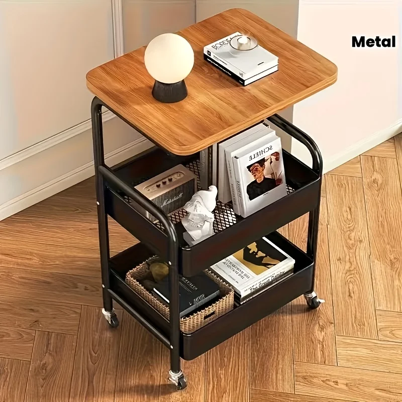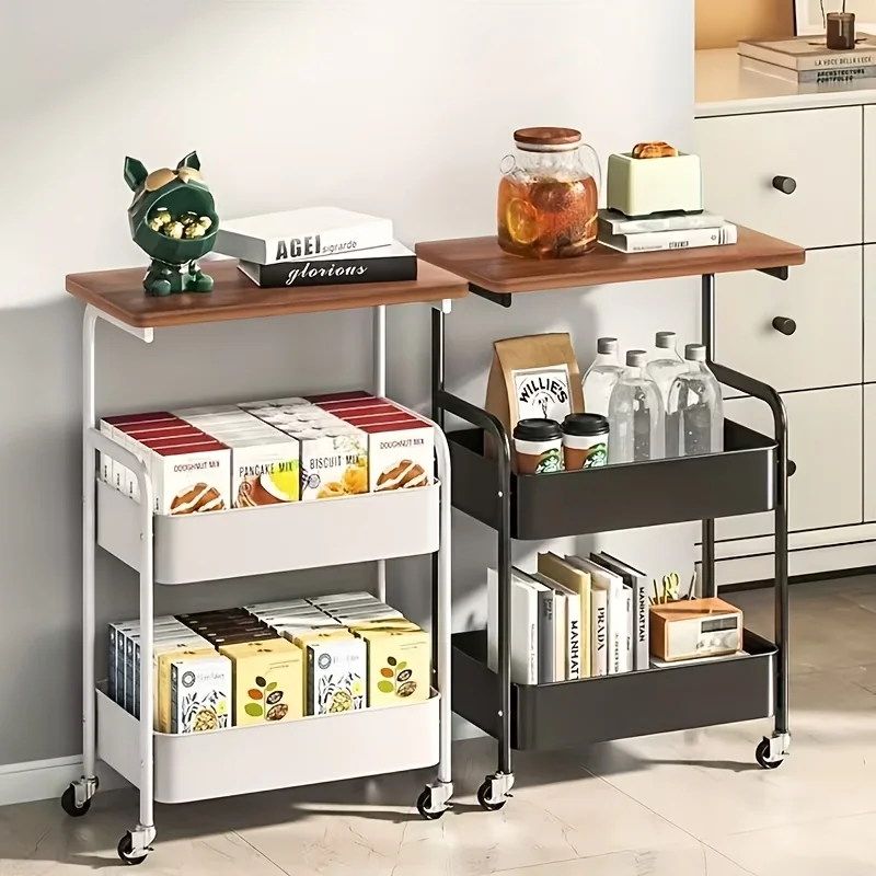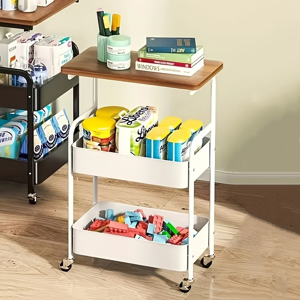 1pc Three-Layer Mobile Storage Cart | with Wooden Tabletop, Sturdy Metal Frame - Universal Wheel for Easy Movement
