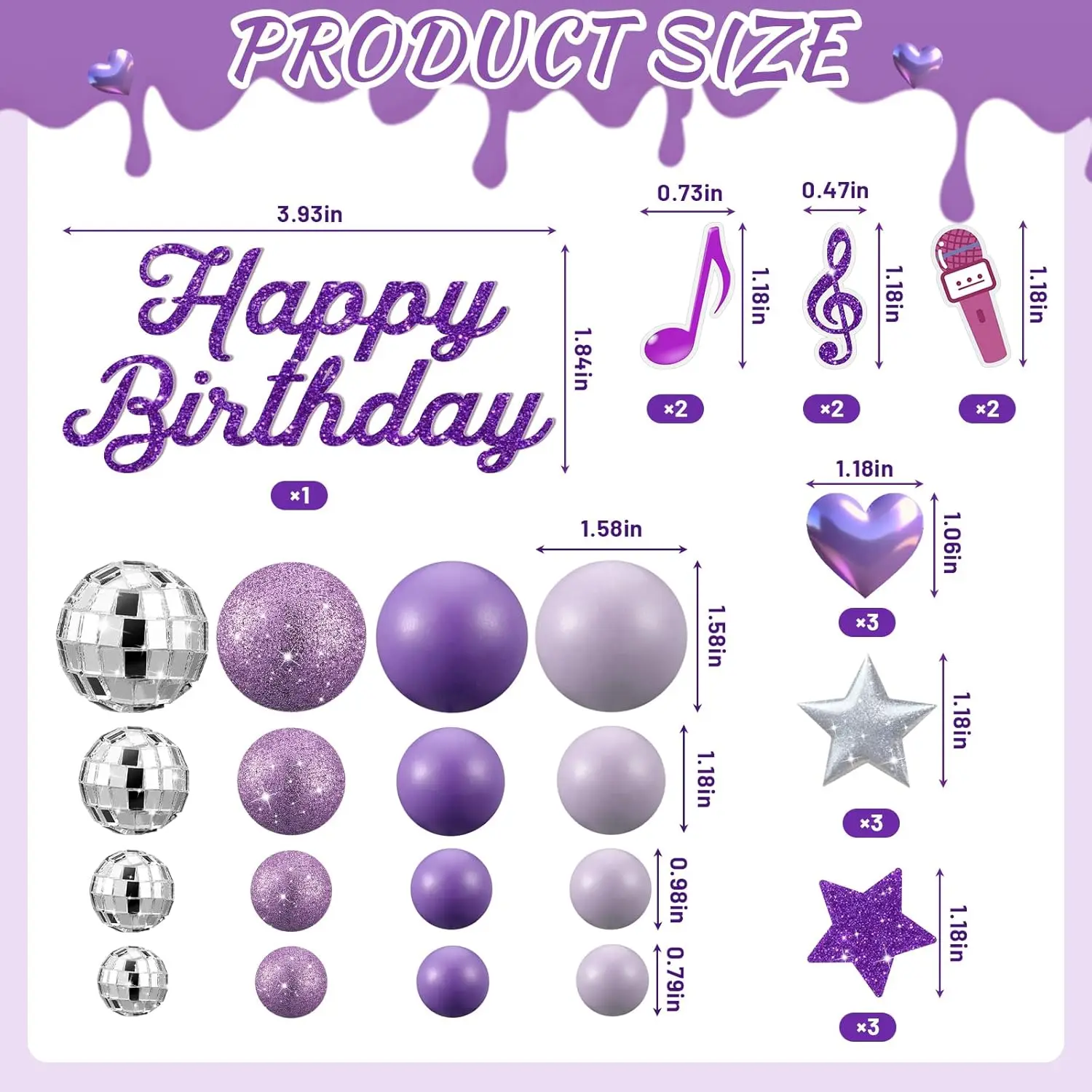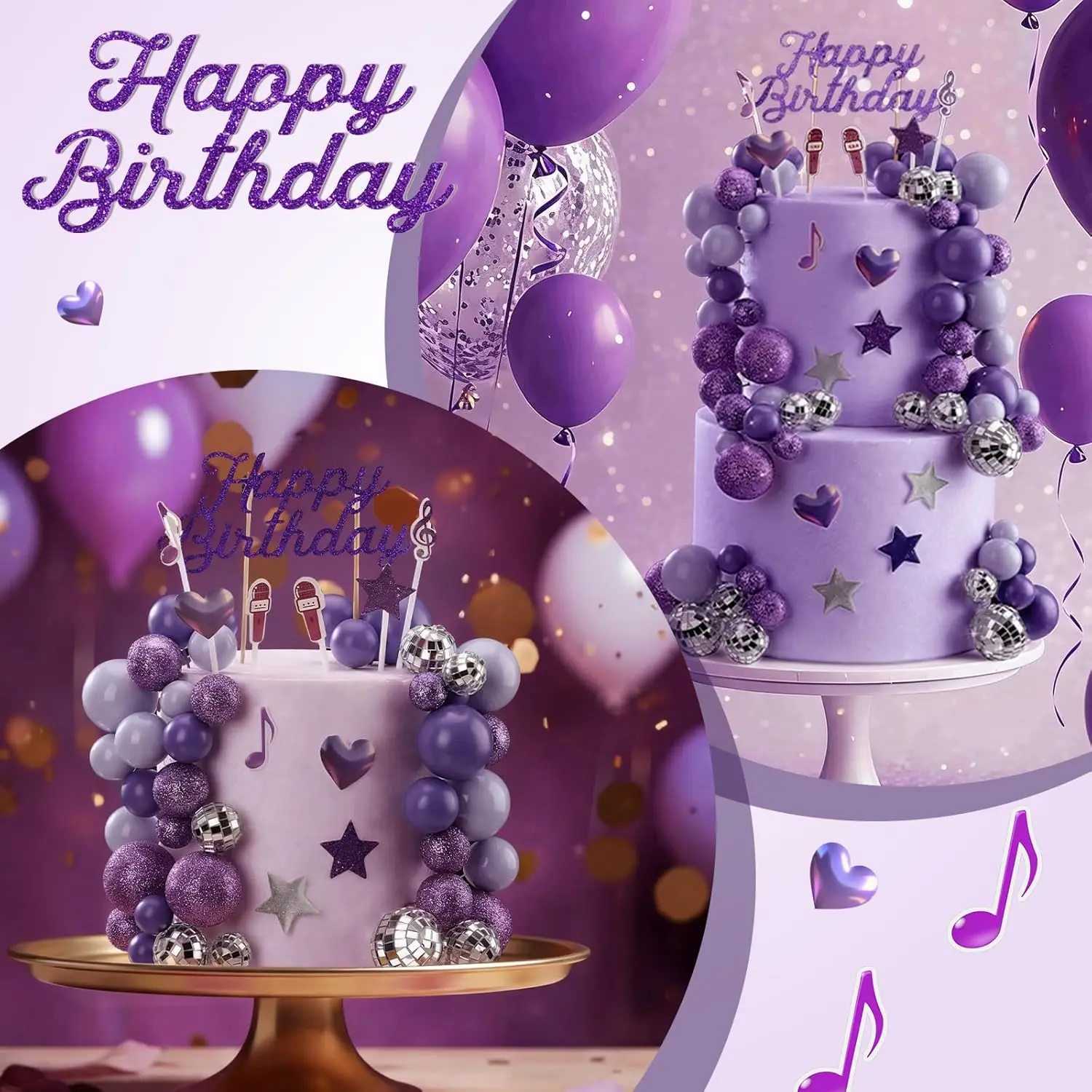 Complete K-Pop Party Cake Topper: Purple Disco Balls, Mic, Hearts & “Happy Birthday” – Music Theme Decor