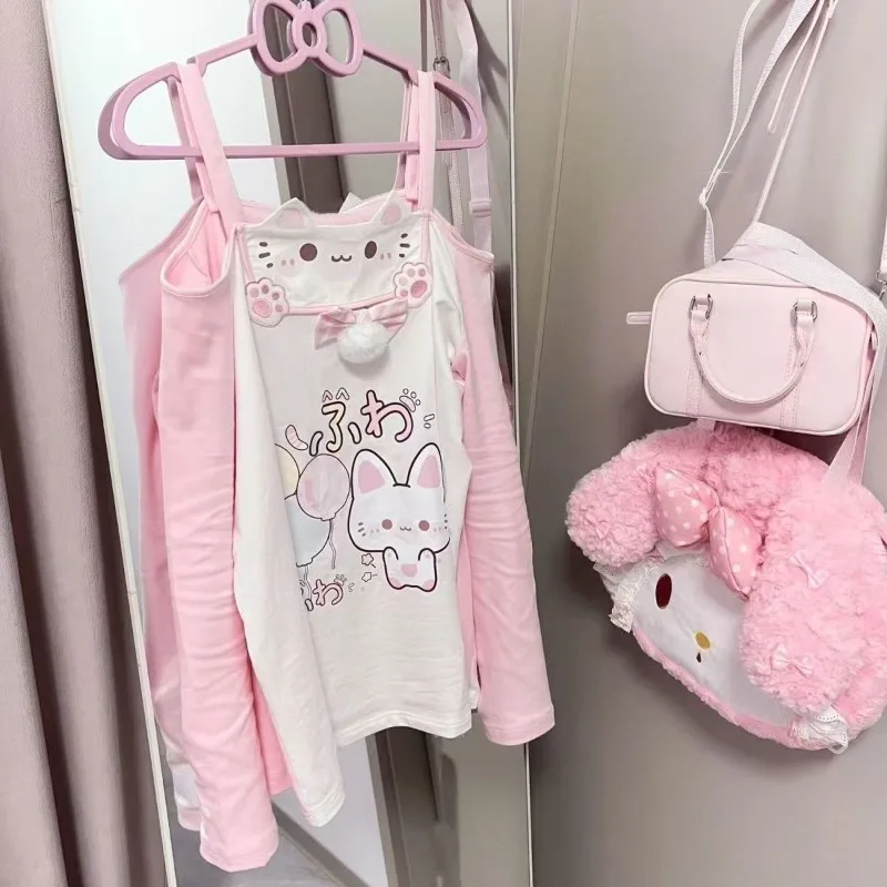 Sweet Japanese T-shirts Women's Clothing Pink Butterfly Patchwork Lace Slash Neck Tees Anime Print Off Shoulder Cute Y2k Tops