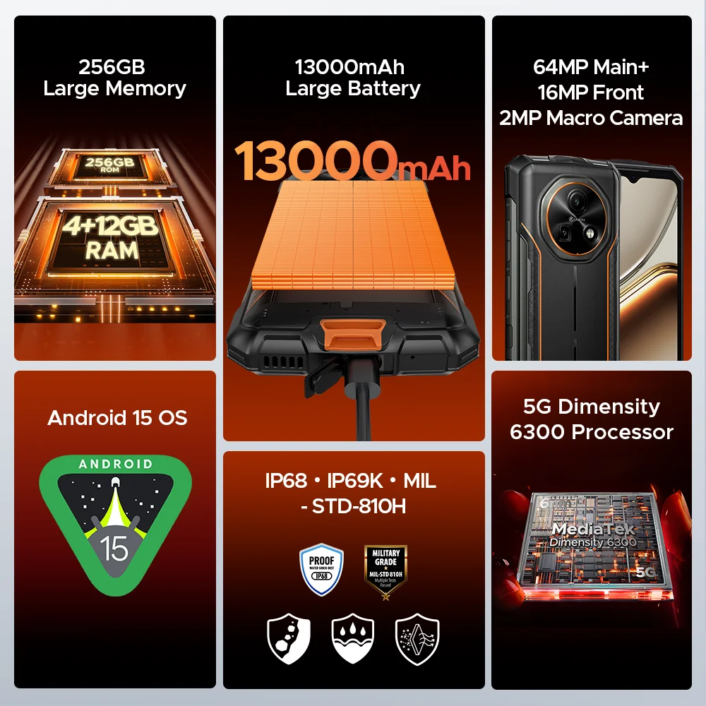 DOOGEE Fire 7 5G Rugged Phone 13000mAh Battery 6.6'' Screen Android 15 64MP Camera 16GB+256GB Dimensity 6300 NFC Smartphone