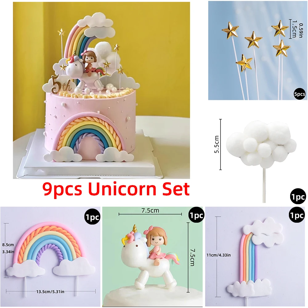 9 pcs unicorn rainbow cake topper unicorn with rainbow clouds stars Happy birthday cake decorations for girls one year old party