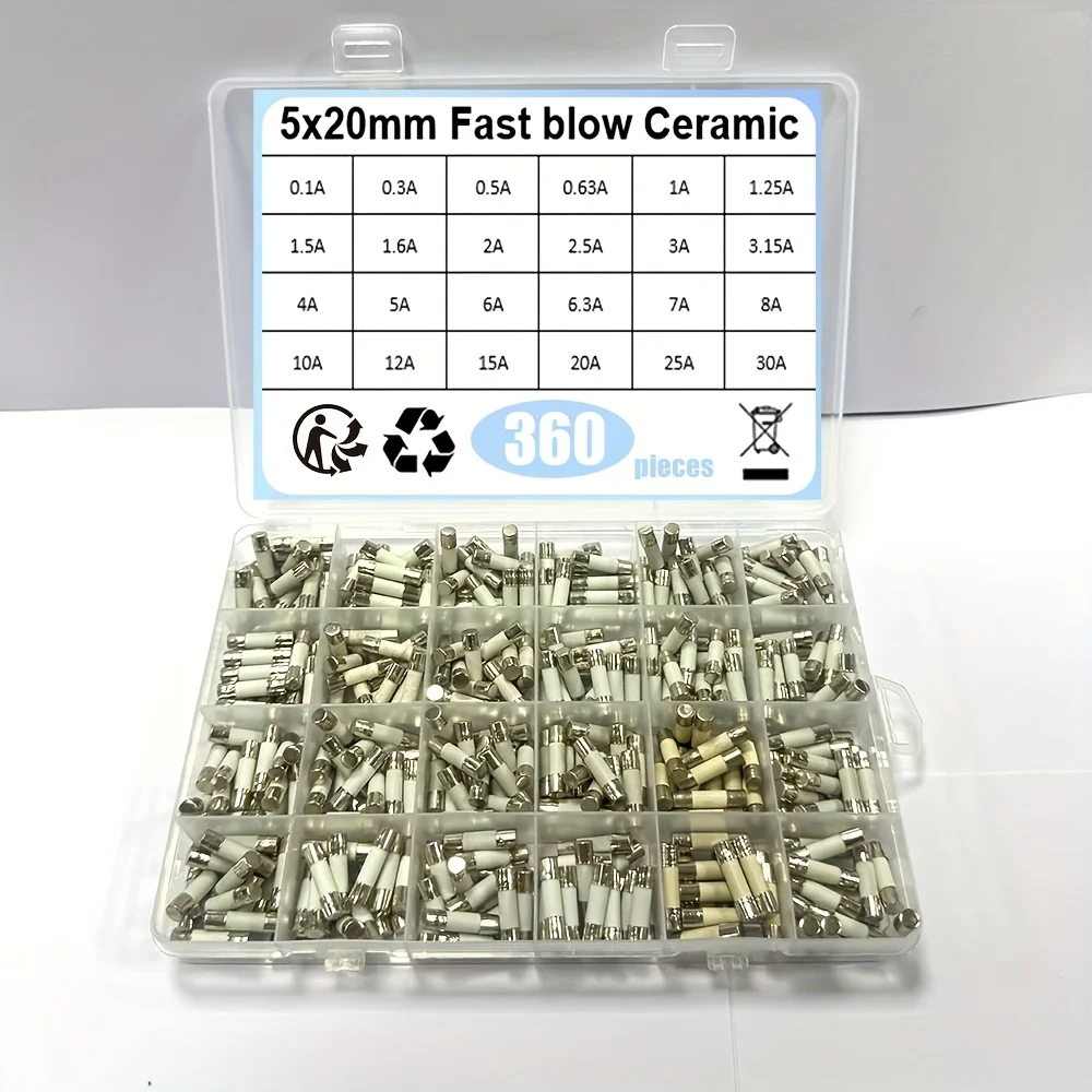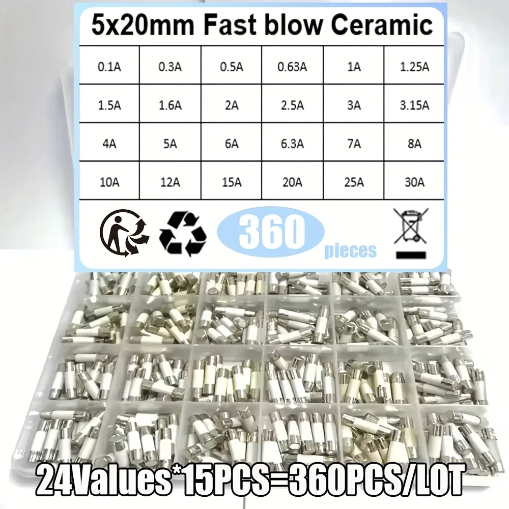 360Pcs/Box 24Values 5*20mm Fast Blow Ceramic Fuse 250V 0.1A 0.25A 0.5A 1A 1.5A 2A 2.5A 3A 3.15A 4A 5A 6A 6.3A 8A 10A 15A 16A